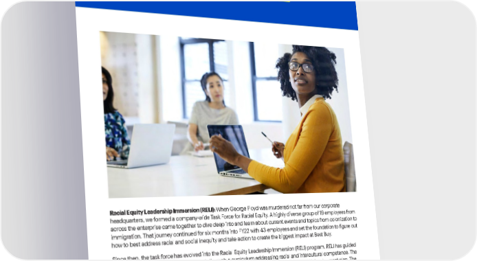 Best Buy Fiscal Year 2022 ESG Report | 48 Diversity, Equity & Inclusion . Racial Equity Leadership Immersion (RELI): When George Floyd was murdered not far from our corporate headquarters, we formed a company-wide Task Force for Racial Equity. A highly diverse group of 19 employees from across the enterprise came together to dive deep into and learn about current events and topics from colonization to immigration. That journey continued for six months into FY22 with 43 employees and set the foundation to figure out how to best address racial and social inequity and take action to create the biggest impact at Best Buy. Since then, the task force has evolved into the Racial Equity Leadership Immersion (RELI) program. RELI has guided individual cohorts of 35 employees each through a curriculum addressing racial and intercultural competence. The group participates in the Intercultural Development Inventory (IDI) to understand their DE&I development plan. The cohort learns tools to help them go out into the organization and lead the acceleration of the attainment of our DE&I goals. Participant feedback consistently reflects that this immersion is personally and professionally life changing, inspiring them to act wherever they can to influence change. RELI’s strategy is to create additional immersive experiences for holistic leadership development in the future.