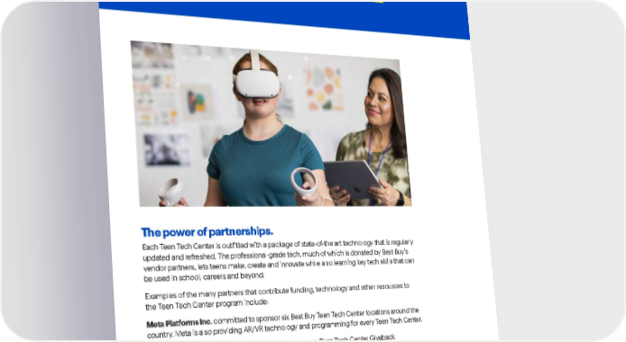 Best Buy Fiscal Year 2022 ESG Report | 77 The power of partnerships. Each Teen Tech Center is outfitted with a package of state-of-the art technology that is regularly updated and refreshed. The professional-grade tech, much of which is donated by Best Buy’s vendor partners, lets teens make, create and innovate while also learning key tech skills that can be used in school, careers and beyond. Examples of the many partners that contribute funding, technology and other resources to the Teen Tech Center program include: Meta Platforms Inc. committed to sponsor six Best Buy Teen Tech Center locations around the country. Meta is also providing AR/VR technology and programming for every Teen Tech Center. Microsoft partnered with Best Buy during our first-ever Teen Tech Center Giveback campaign. Through this campaign, Microsoft committed to donate a portion of Best Buy sales from Surface devices to Teen Tech Centers. Shark Ninja donates high-quality air purifiers to all Teen Tech Centers. The request originated directly from Teen Tech Center staff during the COVID-19 pandemic and is one example of how we have shifted the tech donation assortment to fulfill real-time community needs. Best Buy Teen Tech Centers .