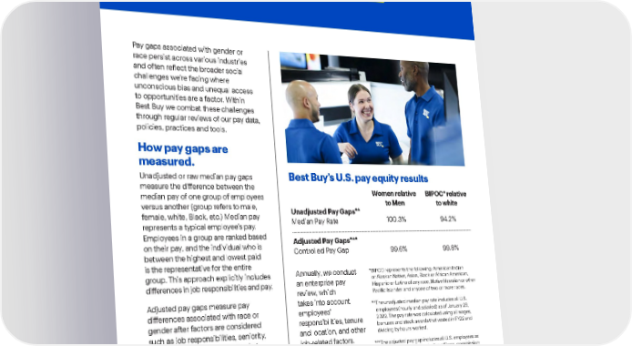 Best Buy Fiscal Year 2022 ESG Report | 42 Diversity, Equity & Inclusion . Annually, we conduct an enterprise pay review, which takes into account employees’ responsibilities, tenure and location, and other job-related factors. Adjustments are made as needed. Ensuring employees are paid fairly and equitably is a goal across our pay processes. Pay gaps associated with gender or race persist across various industries and often reflect the broader social challenges we’re facing where unconscious bias and unequal access to opportunities are a factor. Within Best Buy we combat these challenges through regular reviews of our pay data, policies, practices and tools. How pay gaps are measured. Unadjusted or raw median pay gaps measure the difference between the median pay of one group of employees versus another (group refers to male, female, white, Black, etc.) Median pay represents a typical employee’s pay. Employees in a group are ranked based on their pay, and the individual who is between the highest and lowest paid is the representative for the entire group. This approach explicitly includes differences in job responsibilities and pay. Adjusted pay gaps measure pay differences associated with race or gender after factors are considered such as job responsibilities, seniority, experience and local labor market conditions. This is calculated using a statistical model in an attempt to measure equal pay for equal work. This approach attempts to explicitly focus on measuring whether peers doing similar work with similar qualifications are paid fairly. * B IPOC represents the following: American Indian or Alaskan Native, Asian, Black or African American, Hispanic or Latino of any race, Native Hawaiian or other Pacific Islander and anyone of two or more races. ** T he unadjusted median pay rate includes all U.S. employees (hourly and salaried) as of January 29, 2022. The pay rate was calculated using all wages, bonuses and stock awards that vested in FY22 and dividing by hours worked. *** T he adjusted pay gap includes all U.S. employees as of January 29, 2022, excluding officers, commission- based sales professionals and employees on tenure- based step-rate programs in Supply Chain. The model focuses on base pay, as almost all bonus and stock programs for this population are driven by job level, salary and company results on a formulaic basis. Control variables in the model include job level, time in job level, tenure with Best Buy and local geography. Unadjusted Pay Gaps** Median Pay Rate Adjusted Pay Gaps*** Controlled Pay Gap Women relative to Men BIPOC* relative to white Best Buy’s U.S. pay equity results 100.3% 94.2% 99.6% 99.8%