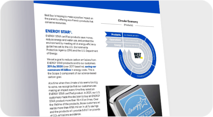 Best Buy Fiscal Year 2022 ESG Report | 18 Best Buy is helping to make a positive impact on the planet by offering eco-friendly products that conserve resources. ENERGY STAR®. ENERGY STAR certified products save money, reduce energy and water use, and protect the environment by meeting strict energy-efficiency guidelines set by the U.S. Environmental Protection Agency (EPA) and the U.S. Department of Energy. We set a goal to reduce carbon emissions from ENERGY STAR products sold to our customers 20% by 2030 (over 2017 baseline), saving our customers $5 billion in energy costs. This is the Scope 3 component of our science-based carbon goal. At a time when the climate crisis seems too big to solve, we recognize that our customers are making an impact every time they select an ENERGY STAR certified product. In 2021, our U.S. customers made the decision to buy an ENERGY STAR product more than 19 million times. Over the lifetime of the products, those customers will realize more than $796 million in utility savings and the products will provide 9.8 billion pounds of CO 2 emissions avoidance. According to the EPA, the ENERGY STAR mark is recognized by 90% of American households. More than 840 utilities, state and local governments, and nonprofits leverage ENERGY STAR in their efficiency programs, reaching roughly 97% of households in all 50 states. Sustainable products . Products . Operations . Energy . Eco-friendly products Carbon-neutral goal S u s t a i n a b l e p a c k a g i n g E - W a s t e r e c y c l i n g E x t e n d i n g p r o d u c t l i f e W a t e r e � i c i e n c y W a s t e d i v e r s i o n E n e r g y e � i c i e n t e q u i p m e n t Fleet electri�ication C l e a n - e n e r g y a d v o c a c y R e n e w a b l e e n e r g y s o u r c i n g Circular Economy (Products)