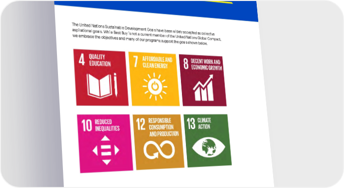 Best Buy Fiscal Year 2022 ESG Report | 101 Sustainable Development Goals . The United Nations Sustainable Development Goals have been widely accepted as collective aspirational goals. While Best Buy is not a current member of the United Nations Global Compact, we embrace the objectives and many of our programs support the goals shown below.