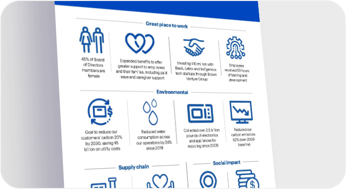Best Buy Fiscal Year 2022 ESG Report | 5 Highlights . Employees received 50 hours of training and development Great place to work Expanded benefits to offer greater support to employees and their families, including paid leave and caregiver support Collected over 2.5 billion pounds of electronics and appliances for recycling since 2009 Environmental Reduced our carbon emissions 62% (over 2009 baseline) Social impact Supply chain Currently support 46 Best Buy Teen Tech Centers Aligned with U.N. Guiding Principles on Business and Human Rights 100% of factories are audited before business is conducted Raised $145 million for St. Jude ® over the last 9 years $ 45% of Board of Directors members are female Investing $10 million with Black, Latinx and Indigenous tech startups through Brown Venture Group Goal to reduce our customers’ carbon 20% by 2030, saving $5 billion on utility costs Reduced water consumption across our operations by 24% since 2019