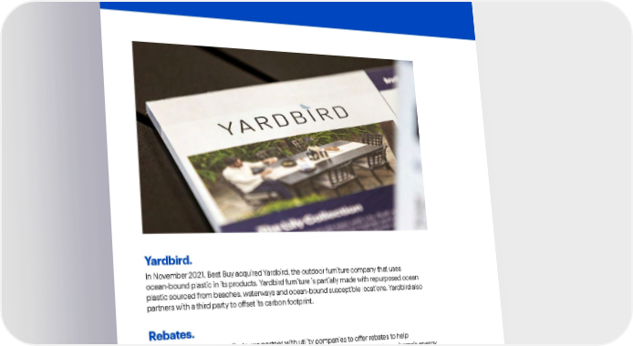 Best Buy Fiscal Year 2022 ESG Report | 20 Sustainable products . Yardbird. In November 2021, Best Buy acquired Yardbird, the outdoor furniture company that uses ocean-bound plastic in its products. Yardbird furniture is partially made with repurposed ocean plastic sourced from beaches, waterways and ocean-bound susceptible locations. Yardbird also partners with a third party to offset its carbon footprint. Rebates. As part of our marketing efforts, we partner with utility companies to offer rebates to help customers use less energy and water. Smart thermostats can have a big impact on a home’s energy usage. Utility rebates on thermostats can significantly reduce the cost to consumers, making it an affordable purchase option for those who could benefit the most. We added technology that enables customers to claim instant rebates during the checkout process, and we also added QR codes to product signage so customers can easily find rebates they qualify for. We project these enhancements will help to drive increased annual sales and simplify the customer experience.
