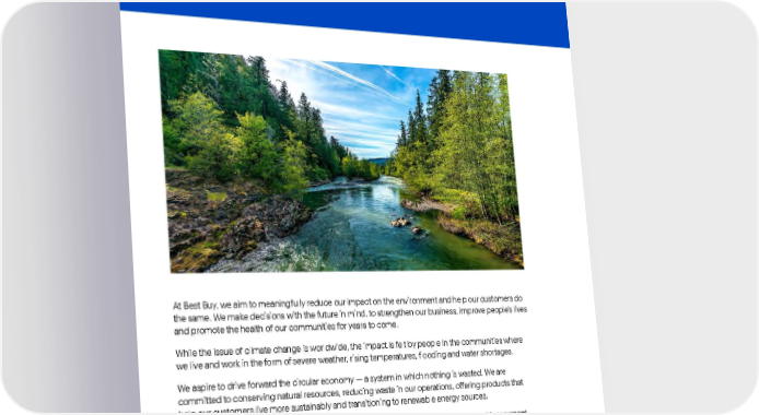 Best Buy Fiscal Year 2022 ESG Report | 10 At Best Buy, we aim to meaningfully reduce our impact on the environment and help our customers do the same. We make decisions with the future in mind, to strengthen our business, improve people’s lives and promote the health of our communities for years to come. While the issue of climate change is worldwide, the impact is felt by people in the communities where we live and work in the form of severe weather, rising temperatures, flooding and water shortages. We aspire to drive forward the circular economy — a system in which nothing is wasted. We are committed to conserving natural resources, reducing waste in our operations, offering products that help our customers live more sustainably and transitioning to renewable energy sources. The foundation of our environmental program is our ISO 14001-certified Environmental Management System (EMS), which covers all U.S. operations. Our EMS helps us systematically manage progress toward our environmental commitments and ensures that we comply with all applicable laws and regulations. In 2012, we were the first U.S. large-format retailer to earn ISO 14001 certification and are certified by a third party to the newest standard, ISO 14001:2015. In FY22, there were no material fines or non-monetary sanctions implemented against Best Buy for environmental non-compliance. Sustainable operations .