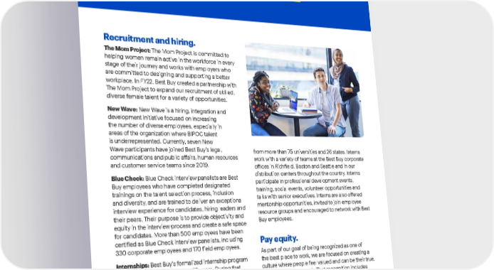 Best Buy Fiscal Year 2022 ESG Report | 41 Diversity, Equity & Inclusion . Recruitment and hiring. The Mom Project: The Mom Project is committed to helping women remain active in the workforce in every stage of their journey and works with employers who are committed to designing and supporting a better workplace. In FY22, Best Buy created a partnership with The Mom Project to expand our recruitment of skilled, diverse female talent for a variety of opportunities. New Wave: New Wave is a hiring, integration and development initiative focused on increasing the number of diverse employees, especially in areas of the organization where BIPOC talent is underrepresented. Currently, seven New Wave participants have joined Best Buy’s legal, communications and public affairs, human resources and customer service teams since 2019. Blue Check: Blue Check interview panelists are Best Buy employees who have completed designated trainings on the talent selection process, inclusion and diversity, and are trained to deliver an exceptional interview experience for candidates, hiring leaders and their peers. Their purpose is to provide objectivity and equity in the interview process and create a safe space for candidates. More than 500 employees have been certified as Blue Check interview panelists, including 330 corporate employees and 170 field employees. Internships: Best Buy’s formalized internship program has been active for more than 10 years. During that time, the internship program has grown and evolved in many ways. In FY23, Best Buy will hire 200 summer interns, making it the company’s largest internship class ever. In addition, 50% of these interns self- identify as BIPOC. Our 10-week internships involve high school, college and graduate-level students from more than 75 universities and 26 states. Interns work with a variety of teams at the Best Buy corporate offices in Richfield, Boston and Seattle and in our distribution centers throughout the country. Interns participate in professional development events, training, social events, volunteer opportunities and talks with senior executives. Interns are also offered mentorship opportunities, invited to join employee resource groups and encouraged to network with Best Buy employees. Pay equity. As part of our goal of being recognized as one of the best place to work, we are focused on creating a culture where people feel valued and can be their true, authentic selves at work. That recognition includes equitable pay, regardless of gender, race, ethnicity or other identities. Pay is an important part of our overall benefits offering, and ensuring employees see our pay system as fair helps to fuel our culture and supports employee engagement.