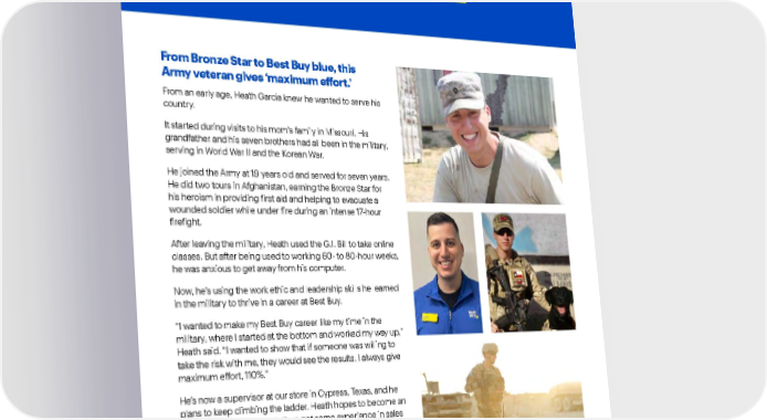 Best Buy Fiscal Year 2022 ESG Report | 51 Diversity, Equity & Inclusion . From an early age, Heath Garcia knew he wanted to serve his country. It started during visits to his mom’s family in Missouri. His grandfather and his seven brothers had all been in the military, serving in World War II and the Korean War. He joined the Army at 19 years old and served for seven years. He did two tours in Afghanistan, earning the Bronze Star for his heroism in providing first aid and helping to evacuate a wounded soldier while under fire during an intense 17-hour firefight. After leaving the military, Heath used the G.I. Bill to take online classes. But after being used to working 60- to 80-hour weeks, he was anxious to get away from his computer. Now, he’s using the work ethic and leadership skills he learned in the military to thrive in a career at Best Buy. “I wanted to make my Best Buy career like my time in the military, where I started at the bottom and worked my way up,” Heath said. “I wanted to show that if someone was willing to take the risk with me, they would see the results. I always give maximum effort, 110%.” He’s now a supervisor at our store in Cypress, Texas, and he plans to keep climbing the ladder. Heath hopes to become an operations manager next, then get some experience in sales before becoming a general manager. His long-term goal is to join a market or territory staff. “There are a lot of things that I learned in the military that transitioned very well,” he said. “I’m very thankful for everything I learned in the military and how I can use it for Best Buy.” From Bronze Star to Best Buy blue, this Army veteran gives ‘maximum effort.’