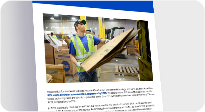 Best Buy Fiscal Year 2022 ESG Report | 15 Waste reduction continues to be an important facet of our environmental strategy, and we’ve set a goal to achieve 85% waste diversion across our U.S. operations by 2025 . We partner with a B Corp-certified software provider to use technology and analytics to improve our waste diversion. We have increased our waste diversion by 7% since FY19, bringing it up to 72%. In FY22, our supply chain facility in Chino, California, was the first location to achieve TRUE certification for zero waste. A TRUE project’s goal is to reduce the amount of waste generated and divert all solid waste from the landfill, incineration (waste-to-energy) and into beneficial re-use and recycling programs. Facilities achieve certification by meeting rigorous program requirements administered by Green Business Certification Inc. In FY23, we are expanding our TRUE certification into more Best Buy supply chain facilities. We continue to invest in new equipment to drive up the recycling rates in our locations. We added 34 new cardboard balers in FY22 to further improve our waste-diversion capabilities. In addition to balers, our supply chain locations use polystyrene densifiers, which break apart and condense polystyrene into cubes, taking up less room on trucks. Waste reduction .