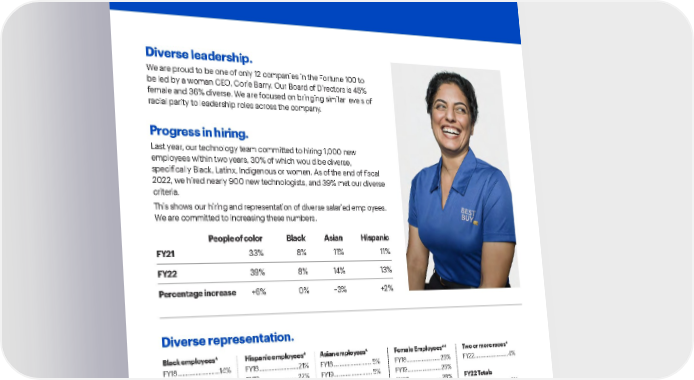 Best Buy Fiscal Year 2022 ESG Report | 59 People of color B lack A sian H ispanic FY21 3 3% 8 % 11% 1 1% FY22 3 9% 8 % 14% 1 3% Percentage increase +6% 0 % + 3% + 2% Diverse leadership. We are proud to be one of only 12 companies in the Fortune 100 to be led by a woman CEO, Corie Barry. Our Board of Directors is 45% female and 36% diverse. We are focused on bringing similar levels of racial parity to leadership roles across the company. Progress in hiring. Last year, our technology team committed to hiring 1,000 new employees within two years, 30% of which would be diverse, specifically Black, Latinx, Indigenous or women. As of the end of fiscal 2022, we hired nearly 900 new technologists, and 39% met our diverse criteria. This shows our hiring and representation of diverse salaried employees. We are committed to increasing these numbers. Measuring progress . Two or more races* FY22 ........................... 4% F Y2 2 To t a l s Manager & above .... 2% VP & above ................ 1% * U.S. employees ** Enterprise-wide employees Black employees* FY18 .......................... 14% FY19 .......................... 14% FY20 ......................... 14% FY21 .......................... 13% FY22 .......................... 14% F Y2 2 To t a l s Manager & above .... 4% VP & above ............... 4% Hispanic employees* FY18 .......................... 21% FY19 ......................... 22% FY20 ........................ 22% FY21 ......................... 22% FY22 ......................... 24% F Y2 2 To t a l s Manager & above .... 7% VP & above ............... 4% Asian employees* FY18 ........................... 5% FY19 ........................... 5% FY20 .......................... 5% FY21 ........................... 5% FY22 ........................... 5% F Y2 2 To t a l s Manager & above ... 12% VP & above ............... 5% Female Employees** FY18 ......................... 26% FY19 ......................... 26% FY20 ........................ 28% FY21 ......................... 27% FY22 ......................... 26% F Y2 2 To t a l s Manager & above .. 34% VP & above .............. 31% Diverse representation.