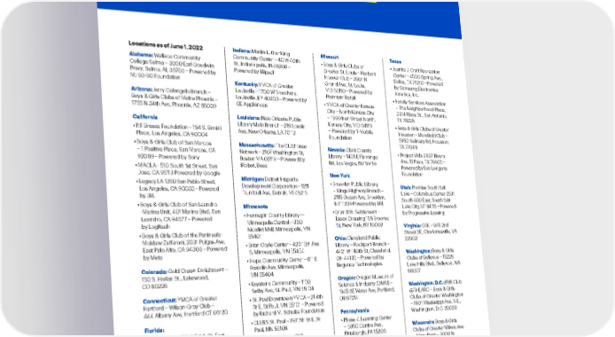 Best Buy Fiscal Year 2022 ESG Report | 80 Locations as of June 1, 2022 Tex a s • J uanita J. Craft Recreation Center – 4500 Spring Ave., Dallas, TX 75210 – Powered by Samsung Electronics America, Inc. • F amily Services Association – The Neighborhood Place, 3014 Rivas St., San Antonio, TX 78228 • B oys & Girls Clubs of Greater Houston – Morefield Club – 5950 Selinsky Rd, Houston, TX 77048 • P roject Vida 3607 Rivera Ave, El Paso, TX 79905 – Powered by Eva Longoria Foundation Utah: Promise South Salt Lake – Columbus Center 2531 South 400 East, South Salt Lake City, UT 84115 – Powered by Progressive Leasing Virginia: C4K – 945 2nd Street SE, Charlottesville, VA 22902 Washington: Boys & Girls Clubs of Bellevue – 15228 Lake Hills Blvd., Bellevue, WA 98007 Washington, D.C.: FBR Club @THEARC – Boys & Girls Clubs of Greater Washington – 1901 Mississippi Ave. S.E., Washington, D.C. 20020 Wisconsin: Boys & Girls Clubs of Greater Milwaukee – Mary Ryan – 3000 N Sherman Blvd, Milwaukee, WI 53210 Vancouver, Canada: Boys and Girls Clubs of South Coast BC – Hillside Club 11339 84 Avenue, Delta, BC V4C 2L9 Missouri • B oys & Girls Clubs of Greater St. Louis – Herbert Hoover Club – 2901 N Grand Ave, St. Louis, MO 63110 – Powered by Premium Retail • Y MCA of Greater Kansas City – North Kansas City – 1999 Iron Street North, Kansas City, MO 64116 – Powered by T-Mobile Foundation Nevada: Clark County Library – 1401 E Flamingo Rd, Las Vegas, NV 89119 N ew Yo r k • B rooklyn Public Library – Kings Highway Branch – 2115 Ocean Ave, Brooklyn, NY 11229 Powered by ERI • G rand St. Settlement - Essex Crossing 168 Broome St, New York, NY 10002 Ohio: Cleveland Public Library – Rockport Branch – 4421 W 140th St, Cleveland, OH 44135 – Powered by Regency Technologies Oregon: Oregon Museum of Science & Industry (OMSI) – 1945 SE Water Ave, Portland, OR 97214 Pennsylvania • P hase 4 Learning Center – 5850 Centre Ave, Pittsburgh, PA 15206 • G reater Philadelphia YMCA – Columbia North YMCA – 1400 North Broad St. Philadelphia, PA 19121 Tennessee: Knowledge Quest - 900 College Park Drive, Memphis, TN 38126 Indiana: Martin Luther King Community Center – 40 W 40th St, Indianapolis, IN 46208 – Powered by Klipsch Kentucky: YMCA of Greater Louisville – 1700 W Broadway, Louisville, KY 40203 – Powered by GE Appliances Louisiana: New Orleans Public Library Main Branch – 219 Loyola Ave, New Orleans, LA 70112 Massachusetts: The Clubhouse Network – 2107 Washington St, Boston MA 02119 – Powered by iRobot, Bose Michigan: Detroit Hispanic Development Corporation – 1211 Trumbull Ave, Detroit, MI 48216 Minnesota • H ennepin County Library — Minneapolis Central – 300 Nicollet Mall, Minneapolis, MN 55401 • B rian Coyle Center – 420 15th Ave S, Minneapolis, MN 55454 • H ope Community Center – 611 E Franklin Ave, Minneapolis, MN 55404 • K eystone Community – 1150 Selby Ave, St. Paul, MN 55104 • S t. Paul Downtown YMCA – 21 4th St E, St Paul, MN 55101 – Powered by Richard M. Schulze Foundation • C LUES St. Paul – 797 7th St E, St Paul, MN 55106 • S ummit Academy OIC – 935 Olson Memorial Hwy, Minneapolis, MN 55405 – Powered by Koch Trucking • T he Capri at Plymouth Christian Youth Center – 2027 W Broadway Ave, Minneapolis, MN 55411 – Powered by Joly Family Foundation Alabama: Wallace Community College Selma – 3000 Earl Goodwin Pkwy, Selma, AL 36703 – Powered by MJ 93-90 Foundation Arizona: Jerry Colangelo Branch – Boys & Girls Clubs of Metro Phoenix – 1755 N 34th Ave, Phoenix, AZ 85009 California • P .F Bresee Foundation – 184 S. Bimini Place, Los Angeles, CA 90004 • B oys & Girls Club of San Marcos – 1 Positive Place, San Marcos, CA 92069 – Powered by Sony • M ACLA - 510 South 1st Street. San Jose, CA 95113 Powered by Google • L egacy LA 1350 San Pablo Street, Los Angeles, CA 90033 – Powered by JBL • B oys & Girls Club of San Leandro -Marina Unit, 401 Marina Blvd, San Leandro, CA 94577 – Powered by Logitech • B oys & Girls Club of the Peninsula - Moldaw-Zaffaroni, 2031 Pulgas Ave, East Palo Alto, CA 94303 – Powered by Meta Colorado: Gold Crown Enrichment – 150 S. Harlan St., Lakewood, CO 80226 Connecticut: YMCA of Greater Hartford – Wilson-Gray Club – 444 Albany Ave, Hartford CT 06120 Florida: • H ANDY Inc. – 501 NE 8th St, Fort Lauderdale, FL 33304 • B oys & Girls Club of Central Florida – JRL Eatonville – 400-B Ruffel St. Eatonville, FL 32751 – Powered by Premium Retail Georgia: Atlanta-Fulton County Library – Central Library – One Margaret Mitchell Square, Atlanta, GA 30303 Best Buy Teen Tech Centers .