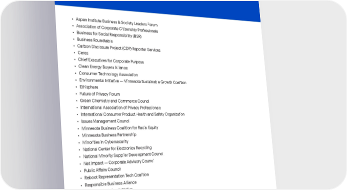 Best Buy Fiscal Year 2022 ESG Report | 96 Association memberships . • Aspen Institute Business & Society Leaders Forum • Association of Corporate Citizenship Professionals • Business for Social Responsibility (BSR) • Business Roundtable • Carbon Disclosure Project (CDP) Reporter Services • Ceres • Chief Executives for Corporate Purpose • Clean Energy Buyers Alliance • Consumer Technology Association • Environmental Initiative — Minnesota Sustainable Growth Coalition • Ethisphere • Future of Privacy Forum • Green Chemistry and Commerce Council • International Association of Privacy Professionals • International Consumer Product Health and Safety Organization • Issues Management Council • Minnesota Business Coalition for Racial Equity • Minnesota Business Partnership • Minorities in Cybersecurity • National Center for Electronics Recycling • National Minority Supplier Development Council • Net Impact — Corporate Advisory Council • Public Affairs Council • Reboot Representation Tech Coalition • Responsible Business Alliance • Responsible Labor Initiative • Responsible Minerals Initiative • Retail Council Canada • Retail & Hospitality Information Sharing and Analysis Center • Retail Industry Leaders Association • Society of Corporate Secretaries and Governance Professionals • Women’s Business Enterprise National Council