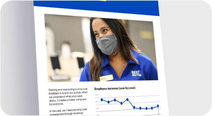 Best Buy Fiscal Year 2022 ESG Report | 28 Seeking and responding to employee feedback is core to our culture. When we understand what employees desire, it creates a better workplace for everyone. In the past, we measured employee engagement through an annual survey event with a high focus on participation and scores, followed by leaders investing significant time into elaborate action plans. We’ve learned that engagement is so much more than just a survey or one-point-in-time event, and we needed to broaden Engaging employees . Employee turnover (year-by-year) FY13 FY20 FY21 FY18 FY19 FY16 FY17 FY14 FY15 FY22 10% 20% 30% 40% 50% FY22: 33.4% (30.6% Voluntary • 2.8% Involuntary)