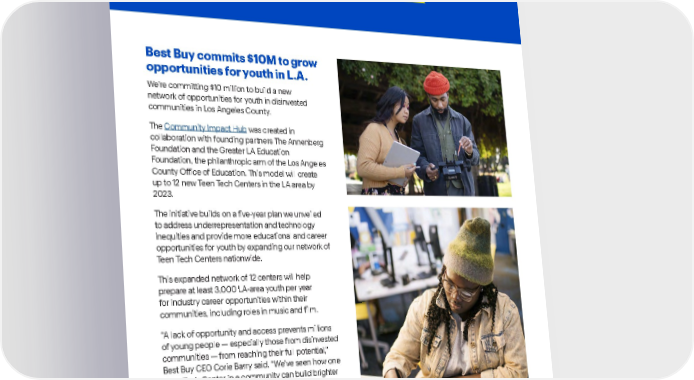 Best Buy Fiscal Year 2022 ESG Report | 79 Best Buy commits $10M to grow opportunities for youth in L.A. We’re committing $10 million to build a new network of opportunities for youth in disinvested communities in Los Angeles County. The Community Impact Hub was created in collaboration with founding partners The Annenberg Foundation and the Greater LA Education Foundation, the philanthropic arm of the Los Angeles County Office of Education. This model will create up to 12 new Teen Tech Centers in the LA area by 2023. The initiative builds on a five-year plan we unveiled to address underrepresentation and technology inequities and provide more educational and career opportunities for youth by expanding our network of Teen Tech Centers nationwide. This expanded network of 12 centers will help prepare at least 3,000 LA-area youth per year for industry career opportunities within their communities, including roles in music and film. “A lack of opportunity and access prevents millions of young people — especially those from disinvested communities — from reaching their full potential,” Best Buy CEO Corie Barry said. “We’ve seen how one Teen Tech Center in a community can build brighter futures, and by partnering with local Los Angeles organizations, we’ll be able to help more youth pursue their dreams.” Best Buy Teen Tech Centers .