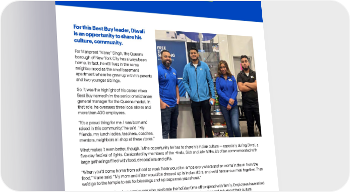 Best Buy Fiscal Year 2022 ESG Report | 50 Diversity, Equity & Inclusion . For Manpreet “Mane” Singh, the Queens borough of New York City has always been home. In fact, he still lives in the same neighborhood as the small basement apartment where he grew up with his parents and two younger siblings. So, it was the highlight of his career when Best Buy named him the senior omnichannel general manager for the Queens market. In that role, he oversees three local stores and more than 400 employees. “It’s a proud thing for me. I was born and raised in this community,” he said. “My friends, my lunch ladies, teachers, coaches, mentors, neighbors all shop at these stores.” For this Best Buy leader, Diwali is an opportunity to share his culture, community. What makes it even better, though, is the opportunity he has to share his Indian culture — especially during Diwali, a five-day festival of lights. Celebrated by members of the Hindu, Sikh and Jain faiths, it’s often commemorated with large gatherings filled with food, decorations and gifts. “When you’d come home from school or work there would be lamps everywhere and an aroma in the air from the food,” Mane said. “My mom and sister would be dressed up in Indian attire, and we’d have a nice meal together. Then we’d go to the temple to ask for blessings and a prosperous year ahead.” Mane makes sure he gives employees who celebrate the holiday time off to spend with family. Employees have asked him for tips on where to buy the best diva lamps, and they share meals together and talk about their culture. “This culture wasn’t talked about much growing up when we went to school or work,” Mane said. “It’s just so cool that now I’m in this position to help bring it to life and make it important so the next generation can feel comfortable and proud to celebrate it.”