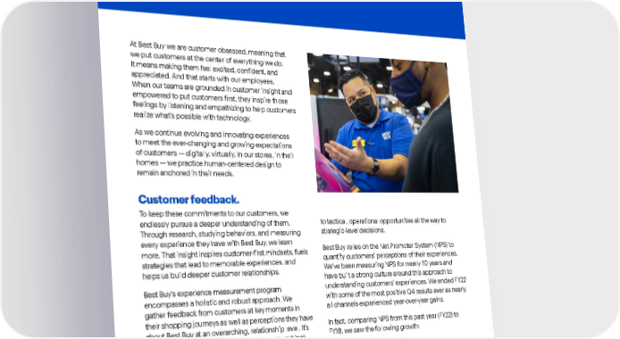 Best Buy Fiscal Year 2022 ESG Report | 30 At Best Buy we are customer obsessed, meaning that we put customers at the center of everything we do. It means making them feel excited, confident, and appreciated. And that starts with our employees. When our teams are grounded in customer insight and empowered to put customers first, they inspire those feelings by listening and empathizing to help customers realize what’s possible with technology. As we continue evolving and innovating experiences to meet the ever-changing and growing expectations of customers — digitally, virtually, in our stores, in their homes — we practice human-centered design to remain anchored in their needs. Customer feedback. To keep these commitments to our customers, we endlessly pursue a deeper understanding of them. Through research, studying behaviors, and measuring every experience they have with Best Buy, we learn more. That insight inspires customer-first mindsets, fuels strategies that lead to memorable experiences, and helps us build deeper customer relationships. Best Buy’s experience measurement program encompasses a holistic and robust approach. We gather feedback from customers at key moments in their shopping journeys as well as perceptions they have about Best Buy at an overarching, relationship level. It’s critical to understand what’s working (or not working) for our customers in the stores, online, in their homes and virtually. Insights garnered from these various listening posts are critical to frontline associates all the way up to executive leaders as they inform everything from coaching opportunities for individual employees Serving our customers . to tactical, operational opportunities all the way to strategic-level decisions. Best Buy relies on the Net Promoter System (NPS) to quantify customers’ perceptions of their experiences. We’ve been measuring NPS for nearly 10 years and have built a strong culture around this approach to understanding customers’ experiences. We ended FY22 with some of the most positive Q4 results ever as nearly all channels experienced year-over-year gains. In fact, comparing NPS from this past year (FY22) to FY18, we saw the following growth: • Store Purchasers: +120bps • E-commerce Purchasers: +700bps • Geek Squad Services (in-store + in-home): +80bps • Home Delivery: +350bps