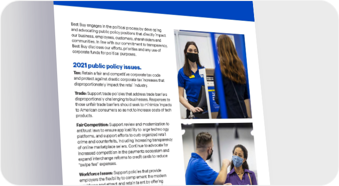Best Buy Fiscal Year 2022 ESG Report | 93 Political activity . Best Buy engages in the political process by developing and advocating public policy positions that directly impact our business, employees, customers, shareholders and communities. In line with our commitment to transparency, Best Buy discloses our efforts, priorities and any use of corporate funds for political purposes. 2021 public policy issues. Ta x: Retain a fair and competitive corporate tax code and protect against drastic corporate tax increases that disproportionately impact the retail industry. Trade: Support trade policies that address trade barriers disproportionally challenging to businesses. Responses to those unfair trade barriers should seek to minimize impacts to American consumers so as not to increase costs of tech products. Fair Competition: Support review and modernization to antitrust laws to ensure applicability to large technology platforms, and support efforts to curb organized retail crime and counterfeits, including increasing transparency of online marketplace sellers. Continue to advocate for increased competition in the payments ecosystem and expand interchange reforms to credit cards to reduce “swipe fee” expenses. Workforce Issues: Support policies that provide employers the flexibility to complement the modern workforce and attract and retain talent by offering competitive wages, benefits and flexible scheduling. Cybersecurity, Data Privacy & Internet of Things: Support policies to strengthen the nation’s cyber infrastructure and committed to safeguarding customer data and ensuring a relationship with customers that better understands and serves their needs and interests.
