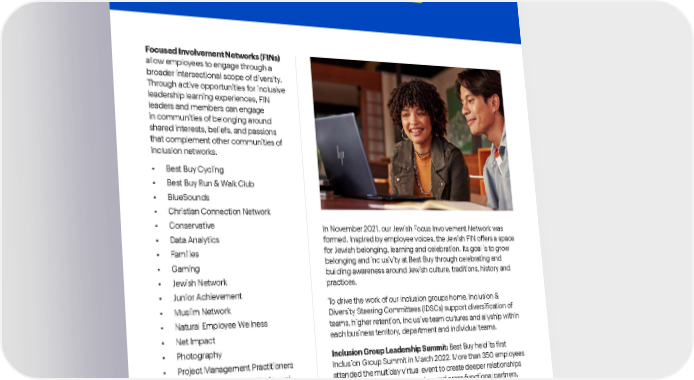 Best Buy Fiscal Year 2022 ESG Report | 47 Diversity, Equity & Inclusion . Focused Involvement Networks (FINs) allow employees to engage through a broader intersectional scope of diversity. Through active opportunities for inclusive leadership learning experiences, FIN leaders and members can engage in communities of belonging around shared interests, beliefs, and passions that complement other communities of inclusion networks. • Best Buy Cycling • Best Buy Run & Walk Club • BlueSounds • Christian Connection Network • Conservative • Data Analytics • Families • Gaming • Jewish Network • Junior Achievement • Muslim Network • Natural Employee Wellness • Net Impact • Photography • Project Management Practitioners • St. Cloud State University Alumni • Toastmasters • University of Minnesota Alumni • University of St. Thomas Tommies In November 2021, our Jewish Focus Involvement Network was formed. Inspired by employee voices, the Jewish FIN offers a space for Jewish belonging, learning and celebration. Its goal is to grow belonging and inclusivity at Best Buy through celebrating and building awareness around Jewish culture, traditions, history and practices. To drive the work of our inclusion groups home, Inclusion & Diversity Steering Committees (IDSCs) support diversification of teams, higher retention, inclusive team cultures and allyship within each business territory, department and individual teams. Inclusion Group Leadership Summit: Best Buy held its first Inclusion Group Summit in March 2022. More than 350 employees attended the multiday virtual event to create deeper relationships between Inclusion Group leaders and cross-functional partners, increase cultural competency and understanding of how to create psychological safety within teams, and increase membership and active participation in Inclusion Groups.