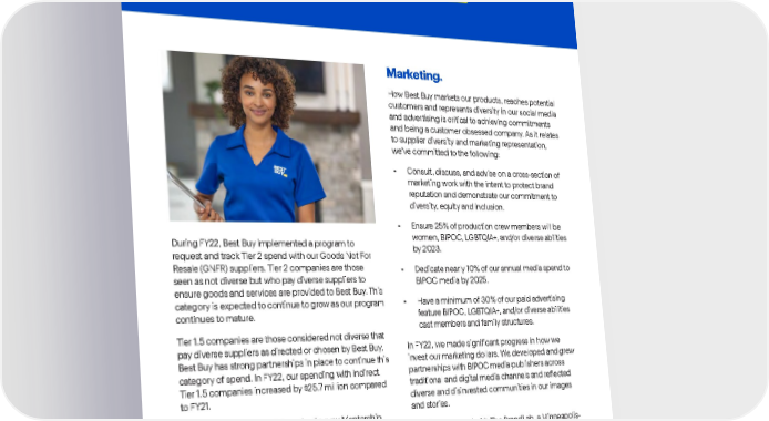 Best Buy Fiscal Year 2022 ESG Report | 54 Diversity, Equity & Inclusion . During FY22, Best Buy implemented a program to request and track Tier 2 spend with our Goods Not For Resale (GNFR) suppliers. Tier 2 companies are those seen as not diverse but who pay diverse suppliers to ensure goods and services are provided to Best Buy. This category is expected to continue to grow as our program continues to mature. Tier 1.5 companies are those considered not diverse that pay diverse suppliers as directed or chosen by Best Buy. Best Buy has strong partnerships in place to continue this category of spend. In FY22, our spending with indirect Tier 1.5 companies increased by $25.7 million compared to FY21. In FY22, Best Buy Canada launched a new Mentorship and Accelerator Program (MAP) that connects Black and Indigenous innovators with mentorship opportunities and a platform to help grow their business. Through this program, we selected two women- and BIPOC-led companies who are working with our teams for business support with the aim to launch products later this year. Marketing. How Best Buy markets our products, reaches potential customers and represents diversity in our social media and advertising is critical to achieving commitments and being a customer obsessed company. As it relates to supplier diversity and marketing representation, we’ve committed to the following: • Consult, discuss, and advise on a cross-section of marketing work with the intent to protect brand reputation and demonstrate our commitment to diversity, equity and inclusion. • Ensure 25% of production crew members will be women, BIPOC, LGBTQIA+, and/or diverse abilities by 2023. • Dedicate nearly 10% of our annual media spend to BIPOC media by 2025. • Have a minimum of 30% of our paid advertising feature BIPOC, LGBTQIA+, and/or diverse abilities cast members and family structures. In FY22, we made significant progress in how we invest our marketing dollars. We developed and grew partnerships with BIPOC media publishers across traditional and digital media channels and reflected diverse and disinvested communities in our images and stories. We also partnered with The BrandLab, a Minneapolis- based non-profit committed to increasing BIPOC representation in advertising and marketing to host 16 LabFellows for eight-month paid internships rotating across Best Buy, Optum, Wunderman Thompson Midwest and Essence.
