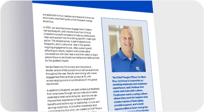 Best Buy Fiscal Year 2022 ESG Report | 29 Engaging employees . our approach to truly capture and respond to how our employees were feeling about the frequent change around us. In 2021, we launched a new engagement initiative named Blueprint, with intuitive tools from Glint (a LinkedIn/Microsoft company) to help us continuously listen and spend more time taking specific meaningful action. The revised survey is administered more frequently, and is just a small step in the greater, ongoing engagement cycle. After reviewing and reflecting on results, leaders hold collaborative conversations with their teams and then select a single area to focus on and build new behavioral habits around for the greatest impact. We facilitated two full surveys and one pulse (a shorter version of the survey) to our various audiences throughout the year. Results were strong with overall engagement from all three surveys at 76, with scores ranging one to six points above Glint’s global benchmark. In addition to Blueprint, we seek continuous feedback from employees through various methods to better understand what we’re doing well and how we can improve their experience on topics ranging from benefits and technology to leadership, culture and serving customers. As a further investment and commitment to this work, we created a Chief People Officer role in February 2022, held by Ray Sliva. The Chief People Officer is responsible for ensuring we attain a broad range of engagement insights and initiatives with the ultimate goal of creating meaningful, positive change for our employees. “As Chief People Officer for Best Buy, my focus is to provide an amazing employee and customer experience, and I believe that starts and ends with culture. Employees want a caring culture where they work for leaders who create a sense of belonging, provide support, and create opportunities to learn and grow. Mastering a great culture for the employee results in a great brand experience for the customer.” – Ray Sliva, Chief People Officer