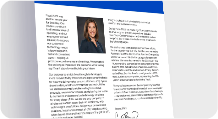 Best Buy Fiscal Year 2022 ESG Report | 3 Message from our CEO . Fiscal 2022 was another record year for Best Buy. Our leaders continued to drive new ways of operating, and our employees worked tirelessly to support our customers’ technology needs in knowledgeable, fast and convenient ways — helping us produce record revenue and earnings. We navigated the prolonged impacts of the pandemic while taking significant steps toward building our future. Our purpose to enrich lives through technology is more relevant today than ever and represents the basis for how we deliver value to our customers, employees, shareholders, and the communities we live in. While we started as a music retailer selling fun-to-have products, we are now focused on delivering our vision to humanize and personalize technology solutions for every stage of life. We are the only company, in all channels and at scale, that can inspire you with technology’s possibilities, design your personalized solutions, install and connect all of it, keep it working when issues arise and help you responsibly get rid of it when it is no longer needed. As a purpose-driven company, we continued to deepen our commitment to our community and the environment. We believe that our Environmental, Social and Governance efforts are not just the right thing to do, but directly tied to long-term value creation and business success. During fiscal 2022, we made significant commitments to drive supplier diversity, expand our Best Buy Teen Tech Center® program and reduce our carbon footprint. You will see the details on our initiatives in the following pages. We are honored to be recognized for these efforts. For the seventh year in a row, Best Buy was named to Fortune’s list of the World’s Most Admired Companies, where we ranked third in the category for specialty retailers. We were also named to the 2022 JUST 100 list, recognizing companies for doing right by all their stakeholders, including our employees, customers, communities, and the environment. Finally, Barron’s ranked Best Buy No. 4 on its prestigious list of 100 most sustainable companies, representing the fifth year in a row we have ranked in the Top 5. To my colleagues across the company, my heartfelt thank you for your dedication and all you do every day on behalf of our customers. I would also like to thank you — our customers, stakeholders, and shareholders — for your continued support, confidence and partnership. Respectfully, Corie Barry, CEO, Best Buy Co., Inc.