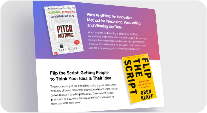 Pitch Anything: An Innovative Method for Presenting, Persuading, and Winning the Deal When it comes to delivering a pitch, Oren Klaff has unparalleled credentials. Over the past 13 years, he has used his one-of-a-kind method to raise more than $400 million-- and now, for the first time, he describes his formula to help you deliver a winning pitch in any business situation. Flip the Script: Getting People to Think Your Idea Is Their Idea These days, it's just not enough to make a great pitch. Over decades of being marketed, pitched, sold (and lied) to, we've grown resistant to sales persuasion. The moment we feel pressured to buy, we pull away. And if we're told what to think, our defences go up.