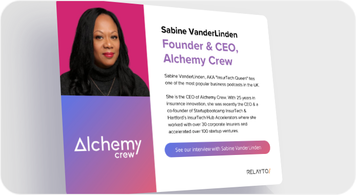 Sabine VanderLinden Founder & CEO, Alchemy Crew Sabine VanderLinden, AKA "InsurTech Queen" has one of the most popular business podcasts in the UK. She is the CEO of Alchemy Crew. With 25 years in insurance innovation, she was recently the CEO & a co-founder of Startupbootcamp InsurTech & Hartford’s InsurTech Hub Accelerators where she worked with over 30 corporate insurers and accelerated over 100 startup ventures. See our interview with Sabine VanderLinden