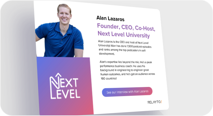 Alan Lazaros Founder, CEO, Co-Host, Next Level University Alan Lazaros is the CEO and host of Next Level University! Alan has done 1,500 podcast episodes and ranks among the top podcasters in self- development. Alan's expertise lies beyond the mic. He's a peak performance business coach. He uses his background in engineering to engineer great human outcomes, and he's got an audience across 160 countries! See our interview with Alan Lazaros
