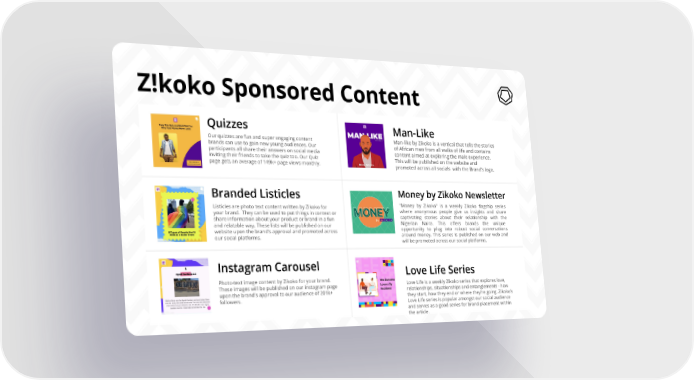 Z!koko Sponsored Content Quizzes Man-Like Our quizzes are fun and super engaging content Man-like by Zikoko is a vertical that tells the stories brands can use to gain new young audiences. Our of African men from all walks of life and contains participants all share their answers on social media content aimed at exploring the male experience. inviting their friends to take the quiz too. Our Quiz This will be published on the website and page gets an average of 149k+ page views monthly. promoted across all socials with the Brand’s logo. Money by Zikoko Newsletter Branded Listicles "Money by Zikoko" is a weekly Zikoko flagship series Listicles are photo text content written by Zikoko for where anonymous people give us insights and share your brand. They can be used to put things in context or captivating stories about their relationship with the share information about your product or brand in a fun Nigerian Naira. This offers brands the unique and relatable way. These lists will be published on our opportunity to plug into robust social conversations website upon the brand’s approval and promoted across around money. This series is published on our web and our social platforms. will be promoted across our social platforms. Instagram Carousel Love Life Series Photo-text image content by Zikoko for your brand. Love Life is a weekly Zikoko series that explores love, These images will be published on our instagram page relationships, situationships and entanglements - how upon the brand’s approval to our audience of 201k+ they start, how they end or where they're going. Zikoko’s followers. Love Life series is popular amongst our social audience and serves as a good series for brand placement within the article.