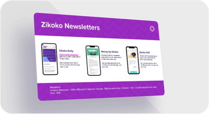 Zikoko Newsletters Zikoko Daily Money by Zikoko Zikoko HER Zikoko’s daily newsletters Money by Zikoko newsletter Zikoko’s HER newsletter goes goes out to 60k+ subscribers goes out to 41.2k+ subscribers out to 27k+ subscribers at at 4pm daily. at 8am every Monday. 9am every Saturday. Our average open rate is Our average opening rate is Our average opening rate is 22.75 and the click through 17.32% and click through rate 16.39% and click through rate rate 1.22% of 2.10% of 1.01% Modalities: Creative dimension - 1280 x 250 pixels | Sponsor message - 250 characters Max | Position - Fold | Creative should not be more than 1MB