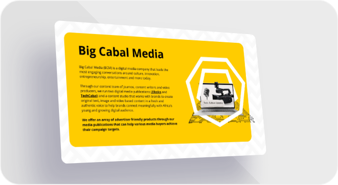 Big Cabal Media Big Cabal Media (BCM) is a digital media company that leads the most engaging conversations around culture, innovation, entrepreneurship, entertainment and more today. Through our content team of journos, content writers and video producers, we run two digital media publications (Zikoko and TechCabal) and a content studio that works with brands to create original text, image and video based content in a fresh and authentic voice to help brands connect meaningfully with Africa’s young and growing digital audience. We offer an array of advertiser friendly products through our media publications that can help various media buyers achieve their campaign targets.