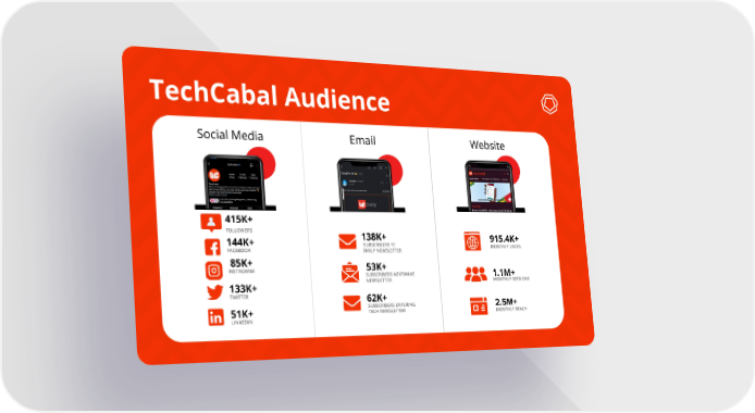 TechCabal Audience Social Media Email Website 415K+ FOLLOWERS 138K+ 915.4K+ 144K+ SUBSCRIBERS TC MONTHLY USERS FACEBOOK DAILY NEWSLETTER 85K+ 53K+ INSTAGRAM SUBSCRIBERS NEXTWAVE 1.1M+ NEWSLETTER MONTHLY SESSIONS 133K+ TWITTER 62K+ SUBSCRIBERS ENTERING 2.5M+ TECH NEWSLETTER 51K+ MONTHLY REACH LINKEDIN
