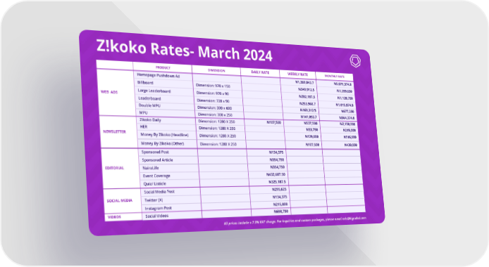 Z!koko Rates- March 2024 MONTHLY RATE DAILY RATE WEEKLY RATE PRODUCT DIMENSION Homepage Pushdown Ad N1,269,843.7 N5,079,374.8 Billboard N349,912.5 N1,399,650 Dimension: 970 x 150 Large Leaderboard N282,187.5 N1,128,750 Dimension: 970 x 90 WEB ADS Leaderboard N253,968.7 N1,015,874.8 Dimension: 728 x 90 Double MPU N169,312.5 N677,250 Dimension: 300 x 600 MPU N141,093.7 N564,374.8 Dimension: 300 x 250 Zikoko Daily N107,500 N537,500 N2,150,000 Dimension: 1280 X 250 HER N53,750 N215,000 Dimension: 1280 X 250 NEWSLETTER Money By Zikoko (Headline) N129,000 N516,000 Dimension: 1280 X 250 Money By Zikoko (Other) N107,500 N430,000 Dimension: 1280 X 250 Sponsored Post N134,375 Sponsored Article N354,750 EDITORIAL NairaLife N354,750 Event Coverage N432,687.50 Quiz/ Listicle N325,187.5 Social Media Post N295,625 SOCIAL MEDIA Twitter (X) N134,375 N215,000 Instagram Post VIDEOS N698,750 Social Videos All prices include a 7.5% VAT charge. For inquiries and custom packages, please email [email protected]