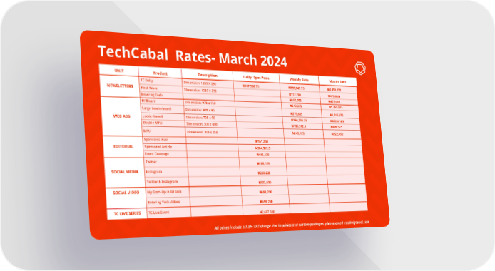 TechCabal Rates- March 2024 UNIT Description Daily/ Spot Price Weekly Rate Month Rate Product TC Daily Dimension: 1280 X 250 ₦167,968.75 ₦839,843.75 ₦3,359,375 NEWSLETTERS Next Wave Dimension: 1280 X 250 ₦117,700 ₦473,000 Entering Tech ₦117,700 ₦473,000 BillBoard ₦349,375 ₦1,255,815 Dimension: 970 x 150 Large Leaderboard Dimension: 970 x 90 ₦275,625 ₦1,015,875 Leaderboard Dimension: 728 x 90 ₦256,226.25 ₦922,414.5 WEB ADS Double MPU Dimension: 300 x 600 ₦169,312.5 ₦609,525 MPU N145,125 N522,450 Dimension: 300 x 250 Sponsored Post ₦161,250 Sponsored Article EDITORIAL ₦384,312.5 Event Coverage ₦446,125 Twitter ₦188,125 Instagram SOCIAL MEDIA ₦209,625 Twitter & Instagram ₦322,500 My Start-Up in 60 Secs SOCIAL VIDEO ₦698,750 Entering Tech Videos ₦698,750 TC Live Event TC LIVE SERIES ₦2,687,500 All prices include a 7.5% VAT charge. For inquiries and custom packages, please email [email protected]