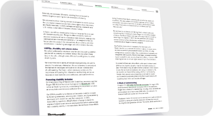 OUR PURPOSE PIONEERING SCIENCE ENVIRONMENT COMMUNITY REPORTING 73 PROMOTING DIVERSITY, EQUITY AND INCLUSION BIOGEN 2021 YEAR IN REVIEW PATIENTS OUR PEOPLE Externally, we sponsored 20 events, providing financial support to community groups spanning multiple dimensions of diversity. We convened multiple listening sessions in response to events such as the U.S. Capitol insurrection and hate crimes against Asian Americans and Pacific Islanders. In 2020, we began recognizing Juneteenth as a U.S. holiday, a year before it became a federal holiday. In Spain, our affiliate developed an Inclusive Language Guide as part of a broader equality plan. The guide offers resources, tools and practical examples of how to incorporate more inclusive language into communications internally and externally. It is designed to help us better take into account the perspectives of our patients and other stakeholders in marketing campaigns and other external channels. LGBTQ+, disability and veteran status We collect self-reported employee data for identities such as LGBTQ+, people with a disability and veteran status. We only collect these data in the U.S., although some affiliates have obligations to collect disability data. We know there are a variety of reasons employees may not want to provide this voluntary information. We are determined to understand the barriers for employee participation so we can increase rates of self-reporting. Our hope is when employees understand the importance of reporting this information confidentially, and as we become an even more inclusive workplace, participation will rise. Promoting disability inclusion On International Day of Persons with Disabilities, we announced that Biogen CEO Michel Vounatsos had signed the Disability:IN ’s CEO Letter on Disability Inclusion, underscoring the importance we place on an equitable and inclusive workplace for all. Our ERN AccessAbility reinforces and supports disability inclusion by fostering awareness, advocacy and inclusion, and by empowering employees with disabilities and their caregivers. In 2021, AccessAbility launched a #SayTheWord campaign to break the stigma of disability and ensure employees feel safe to acknowledge their disability identity in the workplace. We reinforced these efforts during Disability Pride Month, promoting the pride felt by people with disabilities. We also worked with community groups to host internal and external educational sessions on various disability-related topics including “Introduction to Neurodiversity in the Workplace” and “Ableism 101.” We continue to collaborate with Getting Hired, a disability-focused consultancy that is helping to elevate Biogen as a disability employer of choice. Our Talent Acquisition team is helping to launch a disability recruiting pilot program in 2022. We also partnered with colleges and universities to host informational webinars for students with disabilities about Biogen’s internship program. Our Facilities team aims to incorporate the Americans with Disabilities Act as a standard of care for all spaces. In recent years, we made accessibility improvements across our sites, including adding ramps, automatic doors, lifts, accommodative restrooms and designated parking spots. We also have begun conversations about digital accessibility and, as one of our initial efforts, initiated an RFP requiring vendors to include digital accessibility in their proposals. As a result of these and other efforts, we’re proud to have scored 100% on the Disability Equality Index for the fourth consecutive year. At the same time, we seek to better understand what inclusion means for our disabled employees and caregiver community. So, we launched an AccessAbility survey, which will be followed by fireside chats around survey responses as we work to expand our AccessAbility network globally to further support people with disabilities both within and outside of Biogen. A Week of Understanding Alongside the CEO Action for Diversity & Inclusion , the largest CEO- driven business commitment to advance DE&I in the workplace, Biogen held a Week of Understanding, including virtual conversations and opportunities to learn about DE&I within the company, the broader healthcare system and the wider world. Employees hosted 22 internal events covering topics such as inclusive leadership, coping skills for the stress and trauma of racism, and building the next generation of allies. The events, which were hosted in