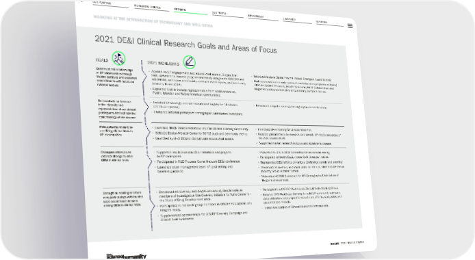 OUR PURPOSE PIONEERING SCIENCE PATIENTS OUR PEOPLE ENVIRONMENT COMMUNITY REPORTING 57 WORKING AT THE INTERSECTION OF TECHNOLOGY AND WELL-BEING BIOGEN 2021 YEAR IN REVIEW 2021 DE&I Clinical Research Goals and Areas of Focus GOALS 2021 HIGHLIGHTS Build trust and relationships in UP communities through trusted partners and sustained commitments with local and national leaders • Advised on UP engagement and educational assets, Biogen Trial Link, Alzheimer’s disease program and study designs for BIIB080 and ADUHELM, and lupus community outreach event topics, as Community Advisory Board (CAB). • Expanded CAB to include representation from Asian American, Pacific Islander and Native American communities. • Received Reuters Global Pharma Patient Champion Award for CAB. • Built sustained community outreach and education programs including CISCRP AWARE, Proximity Health Solutions, HEAL Collaborative and Bright Focus Foundation Virtual Community Outreach Series. Demonstrate an increase in the diversity and representation of our clinical participants that reflects the epidemiology of the disease • Initiated UP strategy and set recruitment targets for 14 studies (100% completed). • Launched internal participant demographic distribution dashboard. • Introduced bespoke strategy for ongoing acute stroke study. Meet patients where they are: Bring clinical trials to UP communities • Launched NMQF Clinical Trial Index and Clinical Trial Learning Community. • Selected Boston Medical Center for TOPAZ study and community events. • Launched suite of DE&I in clinical trials educational assets. • Launched DE&I training for clinical trial sites. • Initiated global efforts to research and identify UP needs and areas of focus at country level. • Supported market research in lupus and Alzheimer’s disease. Champion internal and external change to drive DE&I in clinical trials • Supported and led various DE&I initiatives and projects as UP champions. • Participated in R&D Process Owner Network DE&I conference. • Launched study management team UP goal setting and baseline guidance. • Presented to U.K.’s DE&I Committee for awareness raising. • Participated in Health Equity Ideas Café three-part series. • Represented DE&I efforts on various conference panels and summits • Presented on diversity in clinical trials for the U.K. NIHR and Dementia Industry Group Webinar Series. • Submitted ACTRIMS abstract for MS Demographic Distribution of Biogen’s clinical trials. Strengthen existing and form new partnerships with trusted local and national leaders driving DE&I in clinical trials • Benchmarked diversity and disparities among clinical trials as members of Investigative Site Diversity Initiative for Tufts Center for the Study of Drug Development sites. • Participated as research group members in CISCRP Perceptions and Insights Study. • Supplemented sponsorships for CISCRP Diversity Campaign and Clinical Trial Awareness. • Participated in CISCRP Diversity in Clinical Trials Working Group • Initiated CVS Health partnership to build UP community outreach, data utilization, study specific recruitment efforts, study sites and decentralized models. • Joined Association of Clinical Research Professionals.