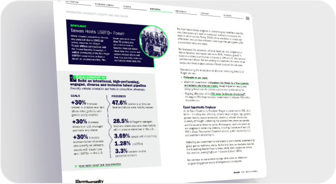 OUR PURPOSE PIONEERING SCIENCE ENVIRONMENT COMMUNITY REPORTING 75 PROMOTING DIVERSITY, EQUITY AND INCLUSION BIOGEN 2021 YEAR IN REVIEW PATIENTS OUR PEOPLE We have made steady progress in diversifying our workforce over the past three years and seek to ensure our workforce represents the world in which we live. Today, 53.9% of our workforce is comprised of females, and we have achieved close to gender parity globally for director-level roles and above. We increased the proportion of Asian American and Indigenous or Native American employees relative to 2020. However, growth in racial and ethnic diversity has plateaued at 26% of U.S. director-level positions and above. We are working to understand this trend as we pursue our diversity goals across different levels of the company. Demonstrating the importance we place on advancing diversity at Biogen are our: – Philosophy on pay equity . – 2020 CEO commitment to MassBio’s CEO Pledge for a More Equitable and Inclusive Life Sciences Industry , recognizing racial inequity and pledging broad, specific and measurable results-oriented action. – Ongoing affirmation of the CEO Action for Diversity & Inclusion™ , the largest CEO-driven business commitment to advance DE&I within the workplace. Equal Opportunity Employer As an Equal Opportunity Employer, Biogen is committed to DE&I of all kinds – including race, ethnicity, national origin, religion, age, gender, gender identity, sexual orientation, disability, veteran status and diversity of thought – reflecting the communities where we operate and the patients whom we serve. We measure, track and report on our progress in advancing diversity, including disclosure of our U.S. EEO-1 (Equal Employment Opportunity) data, global pay equity data and workforce data analysis. Reflecting our commitment to transparency and to better understanding global gender workforce trends, for the first time, we disclosed data for the Bloomberg Gender-Equality Index, which rates companies across five priorities, scoring highly on “Inclusive Culture” (86%). We continue to use external ratings of this kind to inform our longstanding gender equity strategies and disclosures. DE&I STRATEGY #2 Build an intentional, high-performing, engaged, diverse and inclusive talent pipeline Diversity unlocks innovation and locks in competitive advantage. GOALS +30% Increase women in director-level and above roles globally, until gender parity reached +30% Increase diversity in U.S. manager positions and above +30% Increase representation of people who identify as veterans, people with disabilities and LGBTQ+ in the U.S. PROGRESS 47.6% positions at director- level and above were held by women 28.5% of Biogen’s manager- level and above positions were held by ethnic or racial minorities in the U.S. 3.69% (people with disabilities) 1.28% (LGBTQ+) 3.3% (veteran and/or protected veteran) SPOTLIGHT Taiwan Hosts LGBTQ+ Forum When Taiwan’s annual Pride Parade was canceled due to COVID-19 safety concerns, the Biogen Taiwan affiliate collaborated with the Taiwan Equality Campaign, a unified community of the five major LGBTQ+ associations, to host a forum on unconscious bias. The forum welcomed more than 70 participants who learned how to become more conscious about how their words and actions impact others and how they can help make our workplaces more inclusive. Þ READ MORE ABOUT OUR DE&I STRATEGY