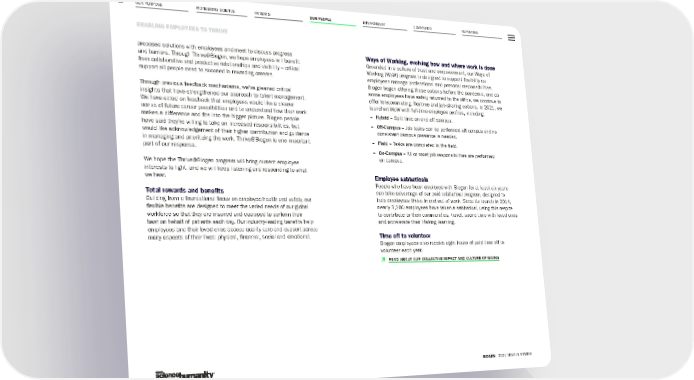 OUR PURPOSE PIONEERING SCIENCE ENVIRONMENT COMMUNITY REPORTING 62 ENABLING EMPLOYEES TO THRIVE BIOGEN 2021 YEAR IN REVIEW PATIENTS OUR PEOPLE proposed solutions with employees and meet to discuss progress and barriers. Through Thrive@Biogen, we hope employees will benefit from collaborative and productive relationships and visibility – critical support all people need to succeed in rewarding careers. Through previous feedback mechanisms, we’ve gleaned critical insights that have strengthened our approach to talent management. We have acted on feedback that employees would like a clearer sense of future career possibilities and to understand how their work makes a difference and fits into the bigger picture. Biogen people have said they’re willing to take on increased responsibilities, but would like acknowledgement of their higher contribution and guidance in managing and prioritizing the work. Thrive@Biogen is one important part of our response. We hope the Thrive@Biogen program will bring current employee interests to light, and we will keep listening and responding to what we hear. Total rewards and benefits Building from a foundational focus on employee health and safety, our flexible benefits are designed to meet the varied needs of our global workforce so that they are inspired and equipped to perform their best on behalf of patients each day. Our industry-leading benefits help employees and their loved ones access quality care and support across many aspects of their lives: physical, financial, social and emotional. Ways of Working, evolving how and where work is done Grounded in a culture of trust and empowerment, our Ways of Working (WoW) program is designed to support flexibility as employees manage professional and personal responsibilities. Biogen began offering these options before the pandemic, and as some employees have safely returned to the office, we continue to offer telecommuting, flextime and job-sharing options. In 2021, we launched WoW with full-time employee profiles, including: – Hybrid – Split time on and off campus. – Off-Campus – Job tasks can be performed off campus and no consistent campus presence is needed. – Field – Tasks are completed in the field. – On-Campus – All or most job responsibilities are performed on campus. Employee sabbaticals People who have been employed with Biogen for at least six years can take advantage of our paid sabbatical program, designed to help employees thrive in and out of work. Since its launch in 2014, nearly 3,200 employees have taken a sabbatical, using this respite to contribute to their communities, travel, spend time with loved ones and accelerate their lifelong learning. Time off to volunteer Biogen employees also receive eight hours of paid time off to volunteer each year. Þ READ ABOUT OUR COLLECTIVE IMPACT AND CULTURE OF GIVING