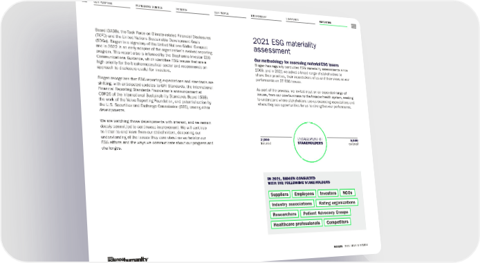 OUR PURPOSE PIONEERING SCIENCE 116 BIOGEN 2021 YEAR IN REVIEW PATIENTS OUR PEOPLE ENVIRONMENT COMMUNITY REPORTING Board (SASB), the Task Force on Climate-related Financial Disclosures (TCFD) and the United Nations Sustainable Development Goals (SDGs). Biogen is a signatory of the United Nations Global Compact and in 2022 is an early adopter of the organization’s evolved reporting program. This report also is informed by the Biopharma Investor ESG Communications Guidance, which identifies ESG issues that are a high priority for the biopharmaceutical sector and recommends an approach to disclosure useful for investors. Biogen recognizes that ESG reporting expectations and standards are shifting, with anticipated updates to GRI Standards, the International Financial Reporting Standards Foundation’s announcement at COP26 of the International Sustainability Standards Board (ISSB), the work of the Value Reporting Foundation, and potential action by the U.S. Securities and Exchange Commission (SEC), among other developments. We are watching those developments with interest, and we remain deeply committed to continuous improvement. We will continue to listen to and learn from our stakeholders, deepening our understanding of the issues they care about as we bolster our ESG efforts and the ways we communicate about our progress and challenges. 2021 ESG materiality assessment Our methodology for assessing material ESG issues Biogen has regularly conducted ESG materiality assessments since 2009, and in 2021 we asked a broad range of stakeholders to share their priorities, their expectations of us and their views on our performance on 27 ESG issues. As part of the process, we invited input on an expanded range of issues, from our core business to the broader health system, seeking to understand where stakeholders see us exceeding expectations and where they see opportunities for us to strengthen our performance. IN 2021, BIOGEN CONSULTED WITH THE FOLLOWING STAKEHOLDERS Employees Researchers Competitors Industry associations Rating organizations Healthcare professionals Patient Advocacy Groups Suppliers Investors NGOs 3,000 external 2,000 internal ENGAGEMENT OF STAKEHOLDERS