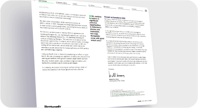 OUR PURPOSE PIONEERING SCIENCE PATIENTS OUR PEOPLE ENVIRONMENT COMMUNITY REPORTING 10 CEO LETTER BIOGEN 2021 YEAR IN REVIEW erythematosus (CLE), with BIIB059. Lupus is a therapeutic area with a different risk profile, and we are continuing to evaluate additional opportunities across specialized immunology. The third pillar is biosimilars, which contributed revenue of $831.1 million in 2021. Our goal is to bring more biosimilar products to more patients across geographies, supporting the sustainability of healthcare systems and accessibility for all. To that end, we announced in January 2022 an agreement with Samsung Biologics Co., Ltd. (Samsung Biologics) to sell our equity stake in the Samsung Bioepis Co., Ltd. (Samsung Bioepis) joint venture to Samsung Biologics. This positions us to pursue further biosimilars opportunities in order to provide patient access to biologic medicines and to contribute to healthcare sustainability. With the closing of this transaction, we will retain our current role as the commercialization partner for the Samsung Bioepis anti-TNF portfolio and ophthalmology programs. Lastly, our fourth pillar is directed at accelerating our efforts in digital health. We aim to leverage our significant database and utilize machine learning and artificial intelligence to develop digital health solutions that may improve patient care, accelerate drug development, and further the understanding of underlying pathologies. In summary, we expect executing on our four strategic pillars will create the opportunity for future growth and value creation. Focused on Execution in 2022 Our focus in 2022 will remain on execution and agility as we expect a number of important milestones. This includes maintaining leadership in our core business, the launch of VUMERITY in the EU, and our expected entry into the U.S. biosimilars market with BYOOVIZ, a biosimilar referencing LUCENTIS®. In the light of the recent decision of CMS to limit coverage for ADUHELM in the U.S., we will be reevaluating certain elements of our infrastructure and reprioritizing our capital allocation in the interest of creating long-term value for our shareholders. As a research-driven biotechnology company, we continue to be centered on delivering therapies at the cutting edge of innovation. We believe we have unique capabilities and experience to leverage progress in neuroscience, technology and biology. In scientific discovery and development, we know the road is not always linear, but I believe we have the best people across Biogen to advance science and access in the pursuit of helping patients and society. I want to thank all my colleagues who work tirelessly to make Biogen such a special company and uphold the highest standards of ethics and integrity. I also want to extend thanks to our collaborators for their essential contributions, and to our investors who entrust us with their capital, which makes everything we do possible. Sincerely, Michel Vounatsos Chief Executive Officer of Biogen We continue to believe in significant potential opportunities in Alzheimer’s disease and depression, two large therapeutic areas with great unmet need.” 1. American Stroke Association. 2. 2018 AHA guidelines on management of ischemic stroke. 3. Free cash flow defined as net cash flow from operations less capital expenditures. 4. aaic.alz.org/downloads2020/2020_Race_and_Ethnicity_Fact_Sheet.pdf . 5. Lupus Foundation of America www.lupus.org/resources/lupus-facts-and-statistics.