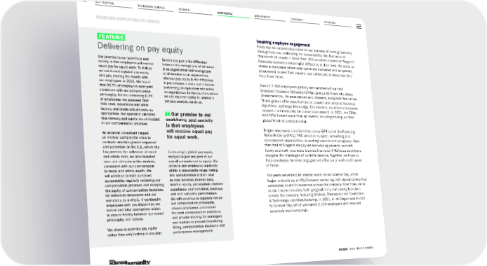 OUR PURPOSE PIONEERING SCIENCE ENVIRONMENT COMMUNITY REPORTING 66 ENABLING EMPLOYEES TO THRIVE BIOGEN 2021 YEAR IN REVIEW PATIENTS OUR PEOPLE Inspiring employee engagement Every day we passionately advance our purpose of serving humanity through science, embracing the responsibility that hundreds of thousands of people in more than 100 countries depend on Biogen’s therapies to make a meaningful difference in their lives. We strive to create a workplace where employees are motivated and supported, empowered to own their careers, and connected to resources that help them thrive. Around 2,300 employees globally are members of our nine Employee Resource Networks (ERNs), groups for those who share characteristics, life experiences and interests, along with their allies. These groups offer opportunities to support and advance business objectives, exchange knowledge, find mentors, volunteer and receive support – all invaluable for career development. In 2021, the ERNs and DE&I hosted more than 60 events, including holding our first global Week of Understanding. Biogen employees also launched a new ERN called the Parenting Network Group (PNG). PNG provides support, networking and development opportunities to working parents and caregivers. More than half of Biogen’s employees are working parents, and with family and work lives more blended than ever, PNG helps employees navigate the challenges of work-life balance. Together, we hope to help employees be more engaged and effective at work and happier at home. For years we’ve held an internal event called Science Day, which began primarily as an R&D-focused convening, with presentations that celebrated scientific advances across the company. Over time, we’ve made it more inclusive, both geographically and among functions across the company, including Medical, Pharmaceutical Operations & Technology and Manufacturing. In 2021, all of Biogen was invited to Science Day, which welcomed 2,100 employees and received extremely positive ratings. FEATURE Delivering on pay equity Our promise to our workforce and society is that employees will receive equal pay for equal work. To deliver, we conducted a global pay equity analysis, sharing the results with our employees in 2021. We found that 99.7% of employees were paid consistent with our compensation philosophy. For the remaining 0.3% of employees, we assessed their skill, level, experience and other factors, and made adjustments, as appropriate. Our approach validated that fairness and equity are embedded in our compensation practices. An external consultant helped us analyze comparable roles to evaluate whether gender impacted compensation. In the U.S., where the law permits the collection of racial and ethnic data, we also included race and ethnicity in the analysis, consistent with our commitment to racial and ethnic equity. We will continue to hold ourselves accountable, regularly reviewing our compensation practices and analyzing the equity of compensation decisions, for individual employees and our workforce as a whole. If we identify employees with pay disparities, we review and take appropriate action to ensure fidelity between our stated philosophy and actions. We chose to examine pay equity rather than only looking at pay gap. Gender pay gap is the difference between the average pay of all males in an organization and average pay of all females in an organization; whereas pay equity is the difference in pay between a male and a female performing an equivalent role within an organization. In the countries where we are required legally to conduct a pay gap analysis, we do so. Conducting a global pay equity analysis is just one part of our overall commitment to equity. We strive to pay employees equitably within a reasonable range, taking into consideration factors such as role; function; market data; internal equity; job location; relevant experience; and individual, business unit and company performance. We will continue to regularly review our compensation philosophy; ensure employees understand the total compensation practices; and provide training for managers and leaders to prevent bias during hiring, compensation decisions and performance management. Our promise to our workforce and society is that employees will receive equal pay for equal work.