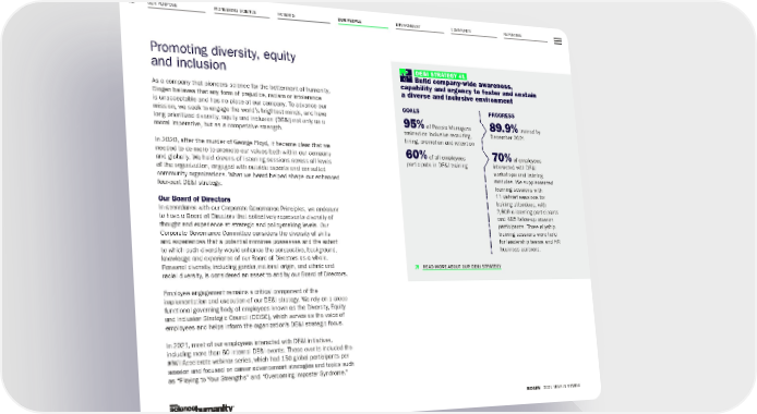 OUR PURPOSE PIONEERING SCIENCE ENVIRONMENT COMMUNITY REPORTING 72 BIOGEN 2021 YEAR IN REVIEW PATIENTS OUR PEOPLE Promoting diversity, equity and inclusion As a company that pioneers science for the betterment of humanity, Biogen believes that any form of prejudice, racism or intolerance is unacceptable and has no place at our company. To advance our mission, we seek to engage the world’s brightest minds, and have long prioritized diversity, equity and inclusion (DE&I) not only as a moral imperative, but as a competitive strength. In 2020, after the murder of George Floyd, it became clear that we needed to do more to promote our values both within our company and globally. We held dozens of listening sessions across all levels of the organization, engaged with outside experts and consulted community organizations. What we heard helped shape our enhanced four-part DE&I strategy. Our Board of Directors In accordance with our Corporate Governance Principles, we endeavor to have a Board of Directors that collectively represents diversity of thought and experience at strategic and policy-making levels. Our Corporate Governance Committee considers the diversity of skills and experiences that a potential nominee possesses and the extent to which such diversity would enhance the perspective, background, knowledge and experience of our Board of Directors as a whole. Personal diversity, including gender, national origin, and ethnic and racial diversity, is considered an asset to and by our Board of Directors. Employee engagement remains a critical component of the implementation and execution of our DE&I strategy. We rely on a cross- functional governing body of employees known as the Diversity, Equity and Inclusion Strategic Council (DEISC), which serves as the voice of employees and helps inform the organization’s DE&I strategic focus. In 2021, most of our employees interacted with DE&I initiatives, including more than 60 internal DE&I events. These events included the #IWillAccelerate webinar series, which had 150 global participants per session and focused on career advancement strategies and topics such as “Playing to Your Strengths” and “Overcoming Imposter Syndrome.” DE&I STRATEGY #1 Build company-wide awareness, capability and urgency to foster and sustain a diverse and inclusive environment GOALS 95% of People Managers trained on inclusive recruiting, hiring, promotion and retention 60% of all employees participate in DE&I training PROGRESS 89.9% trained by December 2021 70% of employees interacted with DE&I workshops and training modules. We supplemented learning sessions with 11 debrief sessions for training attendees, with 2,600 e-learning participants and 485 follow-up session participants. Three allyship training sessions were held for leadership teams and HR business partners. Þ READ MORE ABOUT OUR DE&I STRATEGY