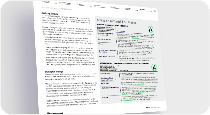 OUR PURPOSE PIONEERING SCIENCE 118 2021 ESG MATERIALITY ASSESSMENT BIOGEN 2021 YEAR IN REVIEW PATIENTS OUR PEOPLE ENVIRONMENT COMMUNITY REPORTING Analyzing the data Our multi-phase analysis included a rank ordering of issues and a review of open-text responses. We combined responses with similar meanings but different wording (e.g., “talent” and “employees”) to uncover patterns in the data. Since combining all stakeholder responses could be misleading, we calculated the average for each stakeholder group and also combined group averages to create a variety of actionable data views. Among other things, we evaluated: – Internal versus external perspectives: We considered whether external stakeholders and employees see Biogen differently, and which audiences hold the highest expectations of us – and on which issues. – Themes by stakeholder group: We looked for significant similarities and differences in how each category of stakeholders sees priority issues. For example, we considered whether investors and suppliers expect different things from Biogen than NGOs or researchers do. – Issue importance vs. performance: By comparing issue importance to stakeholder views of both Biogen’s current and expected performance, we were able to determine whether any gaps were the result of high expectations, low perceptions of performance, or both. Sharing key findings Our analysis found that the relative priority order of issues was largely similar across stakeholders, with internal and external stakeholders agreeing on eight of their top 10 issues. This exercise also uncovered some important shifts. Compared to our last ESG materiality assessment, five of the top 10 issues remained constant, and five new issues entered the top 10. Among the issues that grew in importance are bioethics; workplace/employee health & safety; talent recruitment, retention and engagement; pharmaceuticals in the environment; and health equity. Stakeholder input leads us to see these changes as driven by the ongoing COVID-19 pandemic and the “Great Resignation,” heightened environmental concerns, and the renewed social justice movement. Acting on material ESG issues BUILDING ON BIOGEN’S MANY STRENGTHS Stakeholders perceive key material issues and Biogen strengths as including Our progress Community Engagement & Foundation Giving Biogen and the Biogen Foundation contributed more than $80 million in grants, sponsorships and in-kind contributions in 2021, and this year will celebrate the Foundation’s 20 th anniversary. Þ LEARN MORE Economic Performance With 2021 revenues of $10,982 million, Biogen was #1 in our industry on the JUST 100 for capital management. Þ LEARN MORE Climate Climate is an area where Biogen significantly exceeds expectations. In 2020, Biogen became the first Fortune 500 company to commit to going beyond net zero to achieve 100% fossil fuel free operations by 2040. Þ LEARN MORE Diversity, Equity & Inclusion/ Racial Justice With 47.6% of director and above positions held by women globally and 26% held by minorities in the U.S. in 2021, we are advancing our 4-part DE&I strategy both internally and externally. Þ LEARN MORE R&D, Pipeline & Innovation 94% of stakeholders surveyed see Biogen as a pioneer in neuroscience. Biogen is working to strengthen our culture of innovation, enhance our strategic portfolio and advance our pipeline of therapies. Þ LEARN MORE ADDRESSING KEY OPPORTUNITIES FOR CONTINUOUS IMPROVEMENT Stakeholders perceive key material issues and opportunities for continuous improvement as including Our progress Access & Pricing Biogen is committed to patient access and transparency in our programs and pricing. Þ LEARN MORE Recruitment, Talent Retention & Engagement In a tight labor market, we are actively advancing programs that spark even deeper engagement and enable all employees to thrive at Biogen. Þ LEARN MORE Health Equity Biogen is committed to health equity and access, including clear goals that are part of our 4-part DE&I strategy. Þ LEARN MORE Health System Strengthening From our work with Harvard University to help under-resourced health clinics address climate risks to donations of medical supplies to issue advocacy, Biogen is actively engaged in a wide range of programs to help strengthen health systems around the world. Þ LEARN MORE IN THE PATIENTS AND COMMUNITY SECTIONS OF THIS REPORT Bioethics Biogen is advancing responsible product development, which begins in the earliest stages of R&D, with clear guidelines on issues such as bioethics. Þ READ ABOUT OUR PRINCIPLES, POLICIES AND POSITIONS
