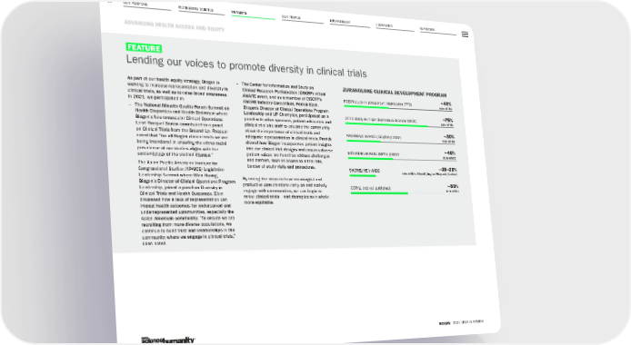 OUR PURPOSE PIONEERING SCIENCE PATIENTS OUR PEOPLE ENVIRONMENT COMMUNITY REPORTING 50 ADVANCING HEALTH ACCESS AND EQUITY BIOGEN 2021 YEAR IN REVIEW FEATURE Lending our voices to promote diversity in clinical trials As part of our health equity strategy, Biogen is working to increase representation and diversity in clinical trials, as well as to raise broad awareness. In 2021, we participated in: – The National Minority Quality Forum Summit on Health Disparities and Health Braintrust where Biogen’s Neuromuscular Clinical Operations Lead Racquel Bruton contributed to a panel on Clinical Trials from the Ground Up. Racquel noted that “for all Biogen clinical trials we are being intentional in ensuring the ethno-racial prevalence of our studies aligns with the epidemiology of the studied disease.” – The Asian Pacific American Institute for Congressional Studies (APAICS) Legislative Leadership Summit where Ellen Huang, Biogen’s Director of Clinical Operations Program Leadership, joined a panel on Diversity in Clinical Trials and Health Outcomes. Ellen discussed how a lack of representation can impact health outcomes for underserved and underrepresented communities, especially the Asian American community. “To ensure we are recruiting from more diverse populations, we continue to build trust and relationships in the community where we engage in clinical trials,” Ellen noted. ZURANOLONE CLINICAL DEVELOPMENT PROGRAM ROBIN study in postpartum depression (PPD) 201b study in major depressive disorder (MDD) WATERFALL in MDD (Clayton poster) MOUNTAIN in MDD (Mittal poster) SHORELINE in MDD CORAL (not yet published) – The Center for Information and Study on Clinical Research Participation (CISCRP) virtual AWARE event, and as a member of CISCRP’s AWARE Industry Consortium, Patrick Ezeh, Biogen’s Director of Clinical Operations Program Leadership and UP Champion, participated on a panel with other sponsors, patient advocates and clinical trial site staff to educate the community about the importance of clinical trials and adequate representation in clinical trials. Patrick shared how Biogen incorporates patient insights into our clinical trial designs and ensures diverse patient voices are heard to address challenges and barriers, such as access to a trial site, burden of study visits and procedures. By taking the steps to have meaningful and productive conversations early on and actively engage with communities, we can begin to make clinical trials – and therapies as a whole – more equitable. ~40% non-white ~75% non-white ~30% non-white ~40% non-white ~20–25% non-white (identifying as Hispanic/Latino) ~50% non-white