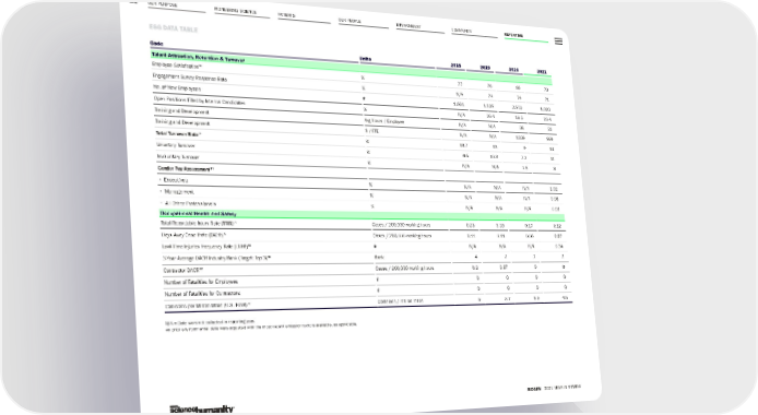 OUR PURPOSE PIONEERING SCIENCE 126 ESG DATA TABLE BIOGEN 2021 YEAR IN REVIEW PATIENTS OUR PEOPLE ENVIRONMENT COMMUNITY REPORTING Code Units 2018 2019 2020 2021 Talent Attraction, Retention & Turnover Employee Satisfaction 32 % 77 76 86 73 Engagement Survey Response Rate % N/A 74 74 71 No. of New Employees # 1,661 1,696 2,679 1,990 Open Positions Filled by Internal Candidates % N/A 26.4 19.5 23.4 Training and Development Avg Hours / Employee N/A N/A 38 32 Training and Development $ / FTE N/A N/A 1339 999 Total Turnover Rate 33 % 13.7 13 9 14 Voluntary Turnover % 9.5 10.3 7.2 11 Involuntary Turnover % N/A N/A 1.8 3 Gender Pay Assessment 34 • Executives % N/A N/A N/A 1.02 • Management % N/A N/A N/A 0.95 • All Other Professionals % N/A N/A N/A 0.99 Occupational Health and Safety Total Recordable Injury Rate (TRIR) 35 Cases / 200,000 working hours 0.23 0.28 0.17 0.12 Days Away Case Rate (DACR) 35 Cases / 200,000 working hours 0.11 0.11 0.06 0.07 Lost-Time Injuries Frequency Rate (LTIFR) 35 # N/A N/A N/A 0.34 3-Year Average DACR Industry Rank (Target: Top 3) 36 Rank 4 2 2 2 Contractor DACR 37 Cases / 200,000 working hours 0.2 0.87 0 0 Number of Fatalities for Employees # 0 0 0 0 Number of Fatalities for Contractors # 0 0 0 0 Collisions per Million Miles (U.S. Fleet) 38 Collisions / million miles 5 3.7 6.9 4.5 N/A = Data were not collected in reporting year. All prior environmental data were adjusted with the most recent emission factors available, as applicable.