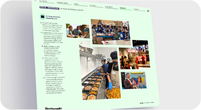 OUR PURPOSE PIONEERING SCIENCE REPORTING 103 BIOGEN 2021 YEAR IN REVIEW PATIENTS OUR PEOPLE SPECIAL ANNIVERSARY 20 YEARS OF SERVING HUMANITY ENVIRONMENT COMMUNITY 1. Partnered with the Italian National Trust, Biogen volunteers refurbish the historic Monastero di Torba in Gornate Olona, Italy, for Care Deeply Day (2013). 2. Food For Free volunteers prepare meals for food insecure families using kitchen space at Biogen’s headquarters through the Heat- n-Eats program (2022). Photo used with permission from Food For Free. 3. Biogen volunteers process donated children’s items at a Cradles to Crayons Giving Factory (2019). Photo used with permission from Cradles to Crayons. 4. Visitors experience the Exploration Hub at the Museum of Science in Boston. The Hub was the result of a $2.5 million grant from the Biogen Foundation to support the museum’s Hall of Human Life exhibition in 2014. Photo used with permission from the Museum of Science. 5. In 2014, the Biogen Foundation made a three-year pledge to support the North Carolina Science Festival as part of the Biogen Foundation’s continuing commitment to STEM education. Photo used with permission from the North Carolina Science Festival. The Biogen Foundation through the years 1 5 2 4 3