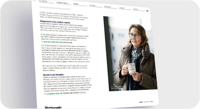 OUR PURPOSE PIONEERING SCIENCE PATIENTS OUR PEOPLE ENVIRONMENT COMMUNITY REPORTING 52 ADVANCING HEALTH ACCESS AND EQUITY BIOGEN 2021 YEAR IN REVIEW In 2021, we also launched a Data Generation DE&I in Medical Research Review Initiative. All 22 studies evaluated met the minimum score, and 20/22 exceeded the minimum score for that criterion. Engagement of key medical experts Our key medical experts (KMEs) provide internal and external guidance, knowledge and support on a variety of health equity topics. They are critical voices with the experience and strategic thinking to help drive solutions that address health inequities. At the 2021 Alzheimer’s Association International Conference (AAIC), our KMEs shared multiple oral and poster presentations from our Alzheimer’s disease clinical development portfolio. Þ READ MORE ABOUT OUR AAIC CONTRIBUTIONS Our UP Working Group is composed of employees with expertise in health equity and/or experience in serving underrepresented and underserved communities, and helped shape and advise on Biogen’s Health Equity policy and initiatives in Alzheimer’s disease. In 2021, UP held four meetings with outputs including the development of the RoAD Show series, a patient perspective video on real-world evidence studies, development of a health equity module as part of ADvance, and the development of a patient/caregiver motivation and expectation survey. We held more than 10 MS Forums with Hispanic MS and medical expert speakers focused on MS cultural competence and shared decision making. Access to our therapies Biogen is dedicated to helping patients obtain access to our therapies. Our skilled patient support representatives have access to a comprehensive suite of financial assistance tools to help patients, their caregivers and healthcare professionals understand, compare and select insurance options and programs that are available to them. We have programs to assist individuals who are uninsured; privately insured; and insured through public programs, such as Medicare. Þ LEARN MORE ABOUT OUR FINANCIAL AND INSURANCE SERVICES Nicole, a rheumatoid arthritis patient in Germany.