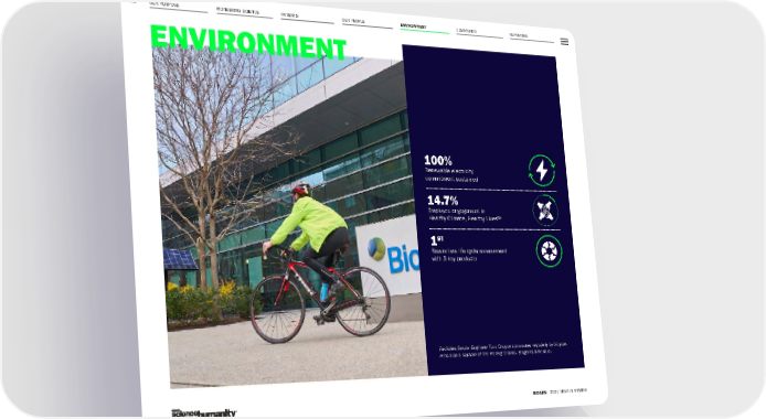 OUR PURPOSE PIONEERING SCIENCE COMMUNITY REPORTING 78 BIOGEN 2021 YEAR IN REVIEW PATIENTS OUR PEOPLE ENVIRONMENT ENVIRONMENT 100% Renewable electricity commitment sustained 14 .7% Employee engagement in Healthy Climate, Healthy Lives™ 1 ST Biosimilars life cycle assessment with 3 key products Facilities Senior Engineer Tom Choyce commutes regularly by bicycle. He’s also a captain of the Rolling Clones, Biogen’s bike club.