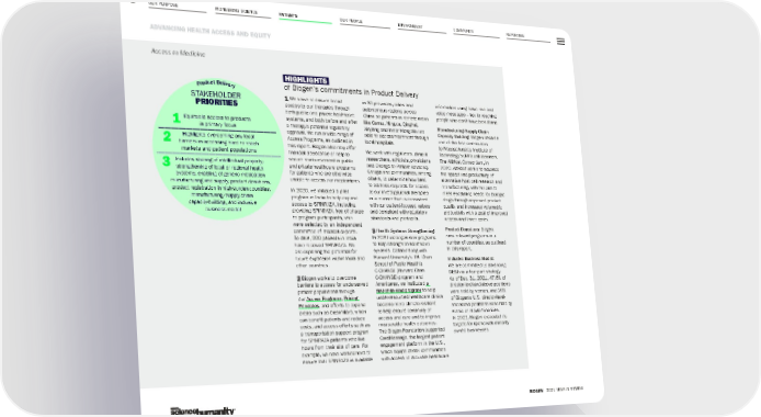OUR PURPOSE PIONEERING SCIENCE PATIENTS OUR PEOPLE ENVIRONMENT COMMUNITY REPORTING 42 BIOGEN 2021 YEAR IN REVIEW ADVANCING HEALTH ACCESS AND EQUITY HIGHLIGHTS of Biogen’s commitments in Product Delivery 1 We strive to ensure broad access to our therapies through both public and private healthcare systems, and both before and after a therapy’s potential regulatory approval. We run a wide range of Access Programs, as outlined in this report. Biogen also may offer financial assistance or help to secure reimbursement in public and private healthcare programs for patients who are otherwise unable to access our medications. In 2020, we initiated a pilot program in India to help expand access to SPINRAZA, including providing SPINRAZA free of charge to program participants, who were selected by an independent committee of medical experts. To date, 200 patients in India have received SPINRAZA. We are exploring the potential for future expansion within India and other countries. 2 Biogen works to overcome barriers to access for underserved patient populations through our Access Programs , Pricing Principles , and efforts to expand areas such as biosimilars, which can benefit patients and reduce costs, and access efforts such as a transportation support program for SPINRAZA patients who live hours from their site of care. For example, we have worked hard to ensure that SPINRAZA is available in 30 provinces, cities and autonomous regions across China so patients in remote areas like Gansu, Ningxia, Qinghai, Xinjiang and Inner Mongolia are able to access treatment through local hospitals. We work with regulators, clinical researchers, ethicists, physicians and Change to Patient Advocacy Groups and communities, among others, to determine how best to address requests for access to our investigational therapies in a manner that is consistent with our patient-focused values and compliant with regulatory standards and protocols. 3 Health Systems Strengthening: In 2020 we began new programs to help strengthen healthcare systems. Collaborating with Harvard University’s T.H. Chan School of Public Health’s C-CHANGE (Harvard Chan C-CHANGE) program and Americares, we instituted a first-of-its-kind program to help under-resourced healthcare clinics become more climate-resilient to help ensure continuity of access and care and to improve measurable health outcomes. The Biogen Foundation supported CareMessage, the largest patient engagement platform in the U.S., which equips at-risk communities with access to accurate healthcare information using basic text and voice messages – key to reaching people who don’t have broadband. Manufacturing/Supply Chain Capacity Building: Biogen became one of the first contributors to Massachusetts Institute of Technology’s (MIT) collaboration, The AltHost Consortium, in 2020. AltHost works to advance the speed and productivity of alternative host cell research and manufacturing, with the aim to meet escalating needs for biologic drugs through improved product quality and increased volumetric productivity with a goal of improved access and lower costs. Product Donations: Biogen runs relevant programs in a number of countries, as outlined in this report. Inclusive Business Model: We are committed to advancing DE&I via a four-part strategy. As of Dec. 31, 2021, 47.6% of director-level-and-above positions were held by women, and 26% of Biogen’s U.S. director-level- and-above positions were held by ethnic or racial minorities. In 2021, Biogen exceeded its targets for spend with minority- owned businesses. P r o d u c t D e l i v e r y STAKEHOLDER PRIORITIES Equitable access to products is primary focus Highlights overcoming any local barriers in accessing hard-to-reach markets and patient populations Includes sharing of intellectual property; strengthening of local or regional health systems; enabling of generic medication manufacturing and supply, product donations, product registration in high-burden countries, manufacturing/supply chain capacity-building, and inclusive business model 1 2 3 Access to Medicine