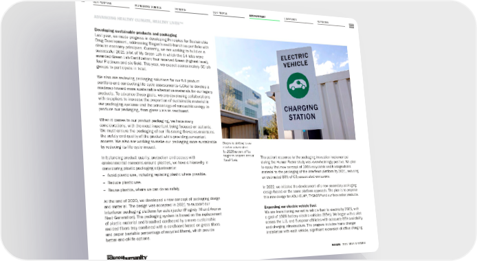 OUR PURPOSE PIONEERING SCIENCE COMMUNITY REPORTING 81 ADVANCING HEALTHY CLIMATE, HEALTHY LIVES™ BIOGEN 2021 YEAR IN REVIEW PATIENTS OUR PEOPLE ENVIRONMENT Developing sustainable products and packaging Last year, we made progress in developing Principles for Sustainable Drug Development, addressing Biogen’s multi-franchise portfolio with circular economy principles. Currently, we are working to build on a successful 2021 pilot of My Green Lab in which the 14 labs were awarded Green Lab Certification: four received Green (highest level), four Platinum and six Gold. This year, we expect approximately 65 lab groups to participate in total. We also are reviewing packaging solutions for our full product portfolio and conducting life cycle assessments (LCAs) to develop a roadmap toward more sustainable alternative materials for our legacy products. To advance these goals, we are developing collaborations with suppliers to increase the proportion of sustainable material in our packaging systems and the percentage of renewable energy to produce our packaging, from glass vials to cardboard. When it comes to our product packaging, we have many considerations, with the most important being focused on patients. We must ensure the packaging of our life-saving therapies maintains the safety and quality of the product while providing convenient access. We also are working to make our packaging more sustainable by reducing its life cycle impact. In balancing product quality, protection and access with environmental concerns around plastics, we have a hierarchy in considering plastic packaging adjustments: – Avoid plastic use, including replacing plastic where possible. – Reduce plastic use. – Reuse plastics, where we can do so safely. At the end of 2020, we developed a new concept of packaging design and material. The design was accepted in 2021 to support our Interferon packaging platform for autoinjector (Plegridy IM and Avonex Next Generation). The packaging system is based on the replacement of plastic material and bleached cardboard by a more sustainable molded fibers tray combined with a cardboard based on grass fibers and paper (variable percentage of recycled fibers), which provide better end-of-life options. The patient response to the packaging innovation implemented during the Human Factor study was overwhelmingly positive. We plan to apply that new concept of 100% recyclable and biodegradable material to the packaging of the interferon platform by 2021, reducing an estimated 80% of CO 2 -associated emissions. In 2022, we initiated the development of a new secondary packaging design based on the same platform approach. The plan is to propose this new design for ADUHELM®, TYSABRI® and our biosimilar products. Expanding our electric vehicle fleet We are transitioning our entire vehicle fleet to electric by 2025, with a goal of 100% battery electric vehicles (BEVs). We began with a pilot across the U.S. and European affiliates with adequate BEV availability and charging infrastructure. The program includes home charger installation with each vehicle, significant expansion of office charging Biogen is shifting to an electric vehicle fleet by 2025 as part of its target to become free of fossil fuels.