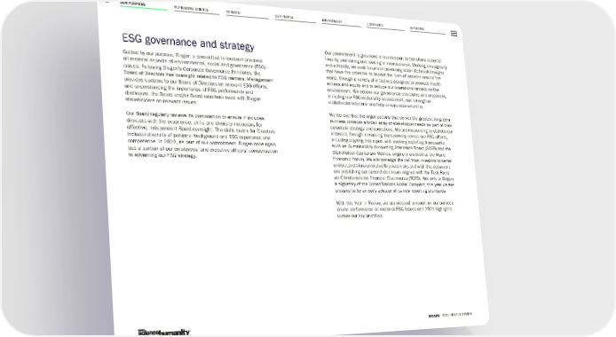 OUR PURPOSE PIONEERING SCIENCE PATIENTS OUR PEOPLE ENVIRONMENT COMMUNITY REPORTING 12 BIOGEN 2021 YEAR IN REVIEW ESG governance and strategy Guided by our purpose, Biogen is committed to leadership across all material aspects of environmental, social and governance (ESG) issues. Following Biogen’s Corporate Governance Principles, the Board of Directors has oversight related to ESG matters. Management provides updates to our Board of Directors on relevant ESG efforts, and understanding the importance of ESG performance and disclosure, the Board and/or Board members meet with Biogen stakeholders on relevant issues. Our Board regularly reviews its composition to ensure it includes directors with the experience, skills and diversity necessary for effective, independent Board oversight. The skills matrix for Directors includes diversity of personal background and ESG experience and competence. In 2022, as part of our commitment, Biogen once again tied a portion of our employees’ and executive officers’ compensation to advancing our ESG strategy. Our commitment is grounded in our mission to transform patients’ lives by pioneering and leading in neuroscience. Working strategically and ethically, we seek to unlock promising scientific breakthroughs that have the potential to impact the lives of patients around the world, through a variety of initiatives designed to promote health access and equity and to reduce our operational impact on the environment. We believe our governance structures and processes, including our ESG materiality assessment, can strengthen stakeholder relations and help ensure accountability. We believe that the organizations that deliver the greatest long-term success consider a broad array of stakeholder needs as part of their corporate strategy and operations. We are responding to stakeholder interests through increasing transparency across our ESG efforts, including aligning this report with evolving reporting frameworks such as Sustainability Accounting Standards Board (SASB) and the Stakeholder Capitalism Metrics, originally unveiled at the World Economic Forum. We acknowledge the call from investors to better understand climate-related financial risks and with this document are publishing our second disclosure aligned with the Task Force on Climate-related Financial Disclosures (TCFD). Not only is Biogen a signatory of the United Nations Global Compact, this year we are pleased to be an early adopter of its new reporting standards. With this Year in Review, we are pleased to report on our purpose- driven performance on material ESG issues and 2021 highlights across our key priorities.