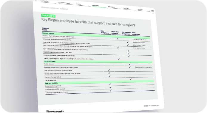 OUR PURPOSE PIONEERING SCIENCE ENVIRONMENT COMMUNITY REPORTING 65 ENABLING EMPLOYEES TO THRIVE BIOGEN 2021 YEAR IN REVIEW PATIENTS OUR PEOPLE OVERVIEW Key Biogen employee benefits that support and care for caregivers Employee benefit 100% of employees 90% or more employees Over two-thirds of employees Under consideration Financial support 16 weeks of paid birth-parent leave with 100% base pay Global standard of 12–16 weeks 8 weeks paid caregiver leave for non-birth parents Global standard of 8 weeks 8 weeks paid caregiver leave for any employee caring for a seriously ill family member Global standard of 8 weeks Up to 5 days paid bereavement leave for death of family member, including pregnancy loss Global standard of 5 days Up to $10,000 (lifetime maximum of $20,000) for adoption / surrogacy expenses $1,000 for expenses associated with a birth doula $100/day in childcare reimbursement for up to 80 days Remote / hybrid employees eligible for a $1,500 stipend to purchase home office equipment Practical support On-site childcare Subsidized backup child and elder care with Bright Horizons Evaluating capability to expand globally Child and elder care resource and referral service No-cost access to mental health support (app, virtual counselor) Employee Resource Network Concierge services Time and flexibility Flexible work arrangements 8 hours paid time off to volunteer 1 month paid sabbatical every 6 years